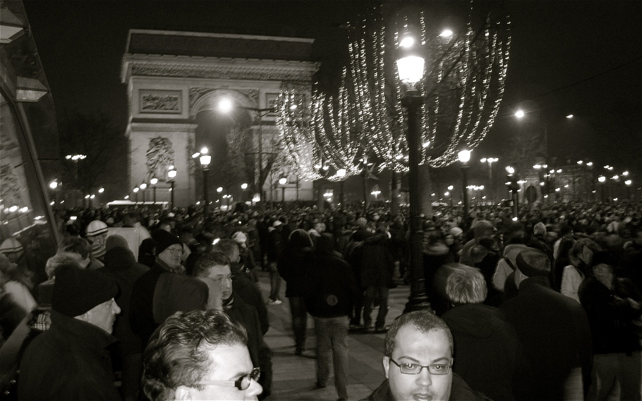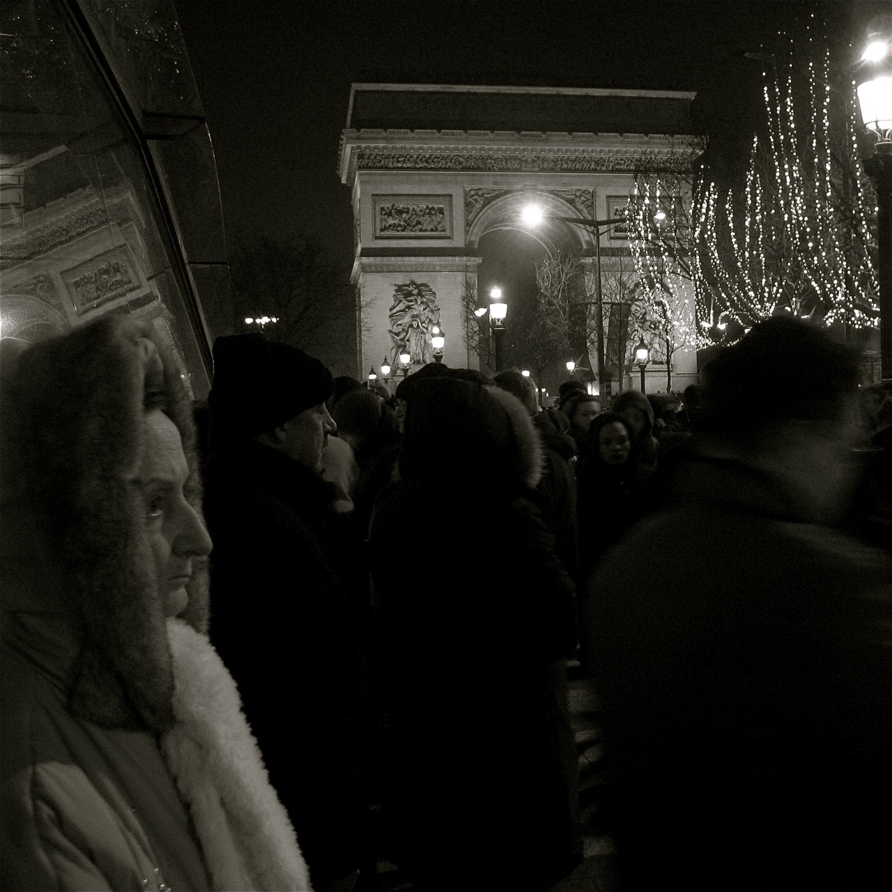 After I uploaded that and got everything arranged here, we got ready to head down to the Champs-Elysées to celebrate the New Year’s arrival. The Metro was free today for all the party goers, so we jumped on for about 20 minutes as we made our way to the Arc de Triomphe. Coming up from the Metro is an incredibly dramatic site. If you ever come to Paris, no matter where you are staying, I suggest the first thing you do when you arrive is exit at the Arc de Triomphe exit. It really sets the mood of your entire stay and is immediately impressive.