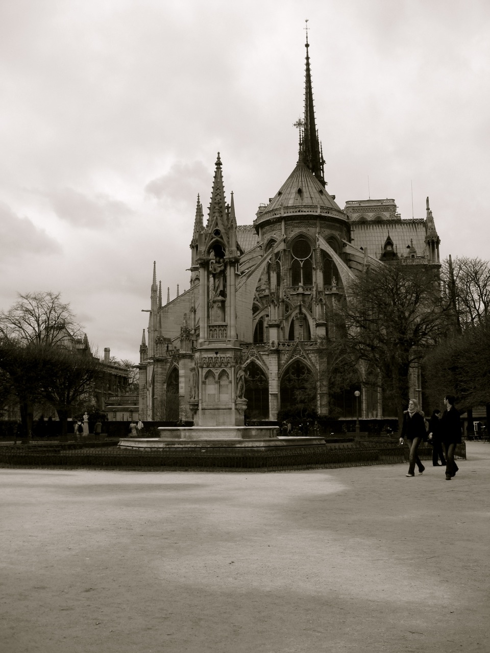 Soon, I was on the next island, the bigger one, where Notre Dame is. I sat in the little park for a while, after glaring at the free wireless Internet sign, and checked my email and used the GPS feature on my iPod. It was pretty cool. I found a piece of of dried bread on a bench, so, I broke it into manageable pieces and tossed it to the birds, they loved me. Then, a retarded kid had to run by, stamp her feet at the birds, and they all flew away. I glared at the brat and she ran away. My birds were back soon enough, but I was out of bread, so, they lost interest.