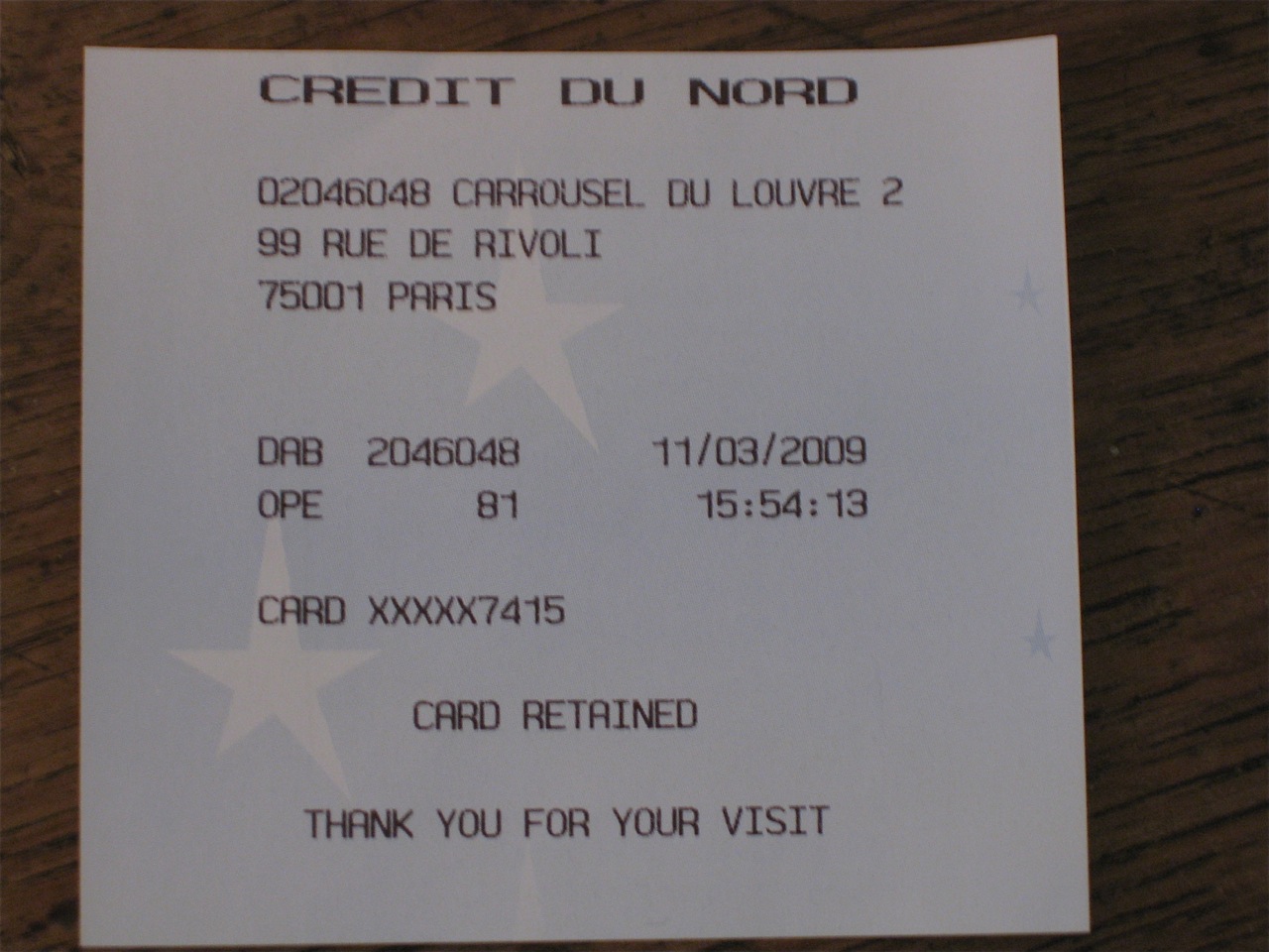 I got to the Louvre, happily put in my card, told it that yes, I’d like a receipt, and that I wanted twenty euros, go! It thought for a minute and then told me that my card was being retained with permission of my bank. I thought it was a joke at first. I’m on a list not to have my card changed. I hit a bunch of buttons, but nothing helped. My card was gone and I would never see it again. I was first sad because it was a pretty orange color, but then the severity of my situation hit me.