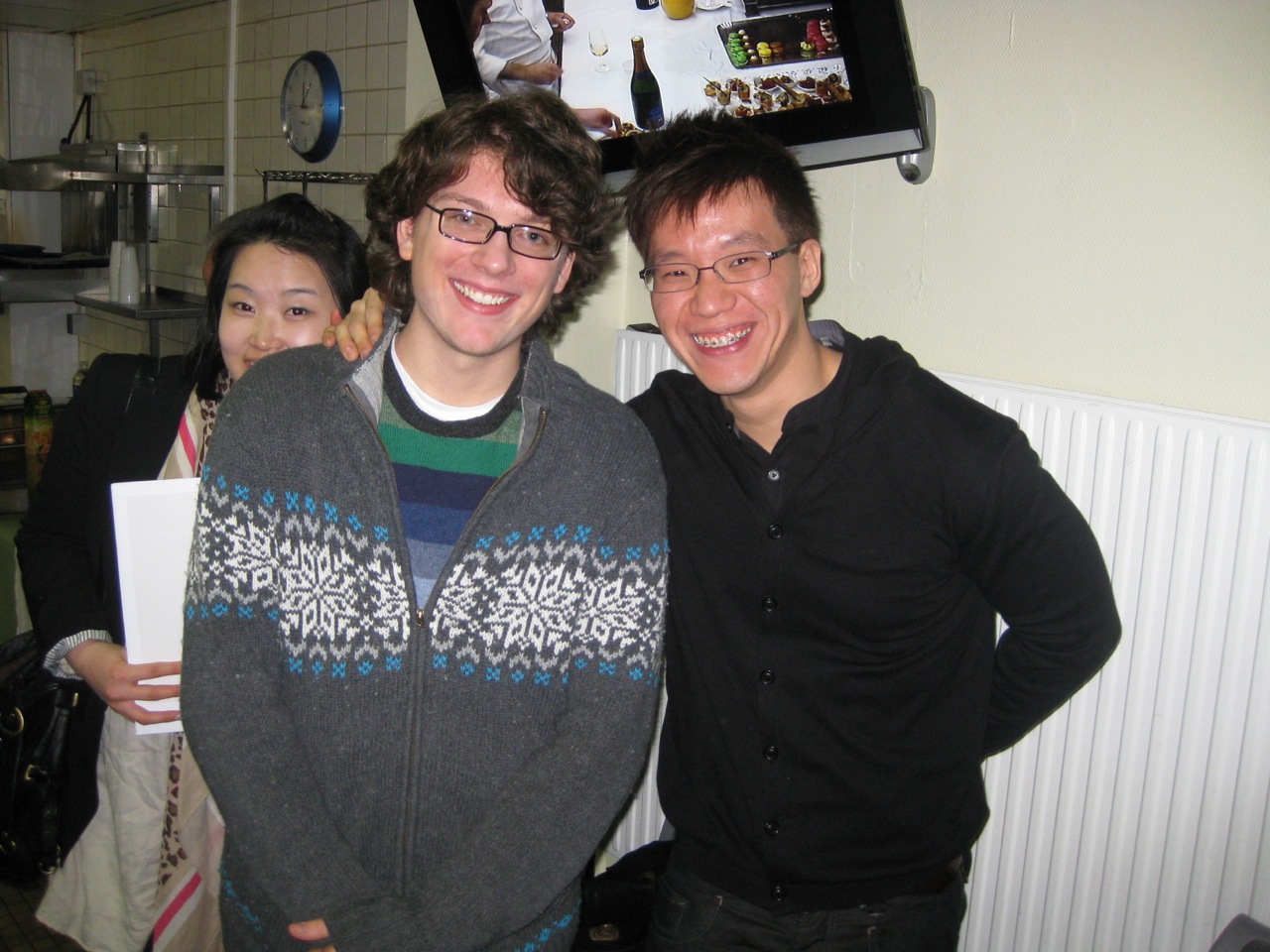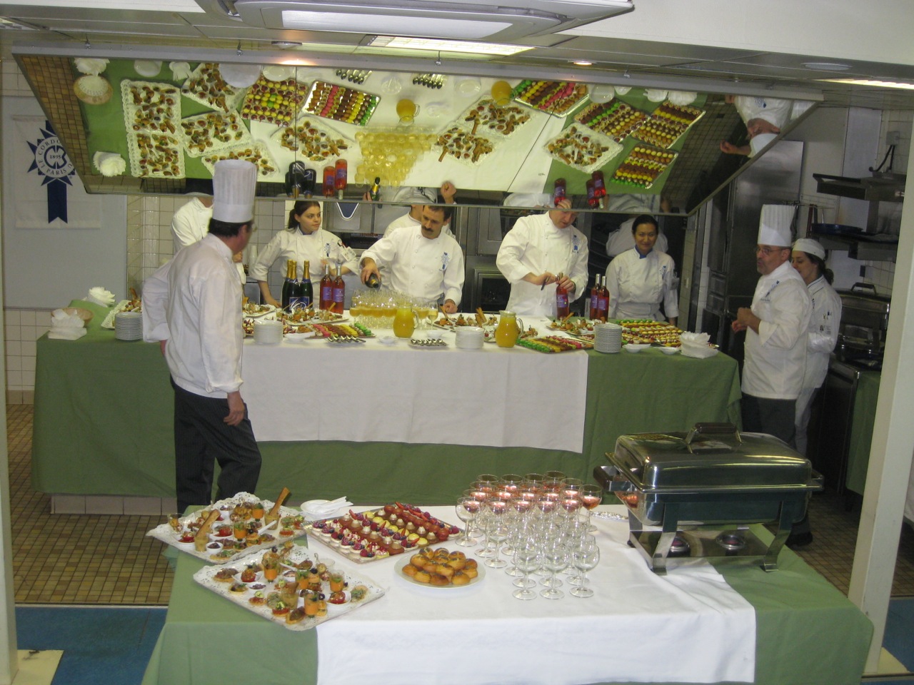 The ceremony finally finished and we were all led to the demonstration room where the chefs had prepared a cocktail party for us! There were macarons and hundreds of other kinds of little pastries. There was this raspberry thing that, when you put it in your mouth, it kind of exploded like Pop Rocks. Champagne after bottle of champagne — they really like their bubbly. Then, my favorite dish was a giant crock-pot thing layered with beef, pork, carrots, potatoes, onions, some kind of cheese, and all soaking in chicken stock. It was very good.