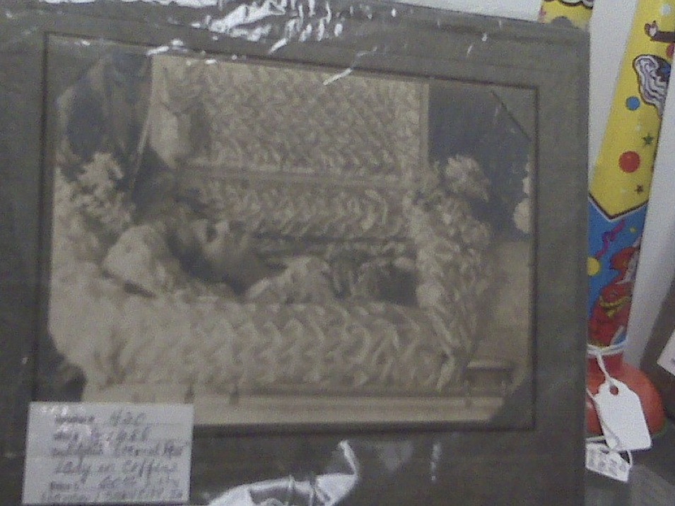 Another delightful find, and something Pa and I are endlessly fascinated by, was a picture of a dead woman in a casket. In antique stores there are always a few pictures of dead people at their funeral, or a picture of all the flowers at the funeral. It is a strange and macabre thing, keeping a picture of the dead, yet somehow sweet. I don’t think I’d like to have a photo of my dead family members in an album. But, these images are always so interesting. I’d like to get one for Pa as a gift once.