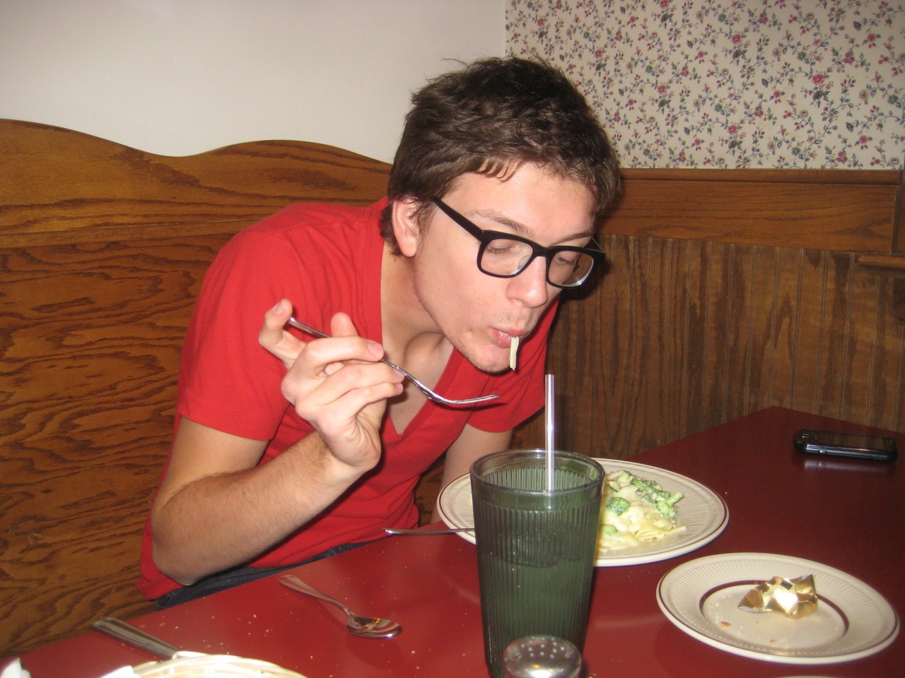 I scoured the menu for vegetarian options, and while I could have had any potato dish of my liking, that wasn’t to my liking. I instead had the shrimp alfredo without the shrimp. The waitress was very nice, but another crazy. She had disturbingly wide eyes and did everything with the cheery smile of someone who is clearly overdosing on uppers. The first alfredo had been made with shrimp, but she made them redo the entire dish, for which I was grateful. She seemed to be very sympathetic to my plight. The alfredo ended up being flavorless and vile and filled with broccoli, which I had begun to believe I liked, but this disproved that nonsense. It tasted mildly of grassy urine on a plate of mushy noodles. I tried to eat about half and then was finished.
