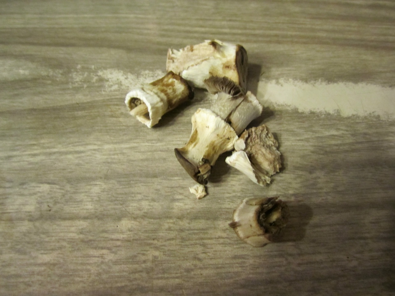 About three mushrooms. Brush off any dirt or mud and remove the stems.