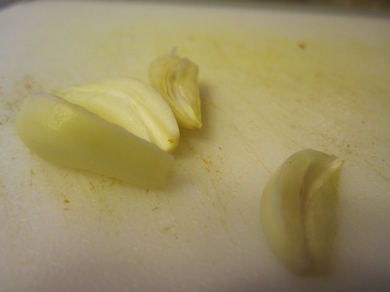 Peel a garlic clove or two and slice off the bottoms. [See the green sprout on the clove on the right? We are going to take care of that.]