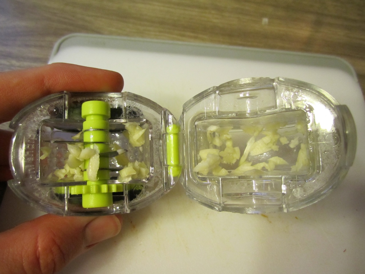 I am going to use the Garlic Zoom my aunt bought me to chop the garlic. I love this little thing! I really dislike chopping garlic because it gets sticky and clings to the blade and then if you only have one clove it’s exhausting. Instead, you can just pop the cloves in here, roll it over your counter and…