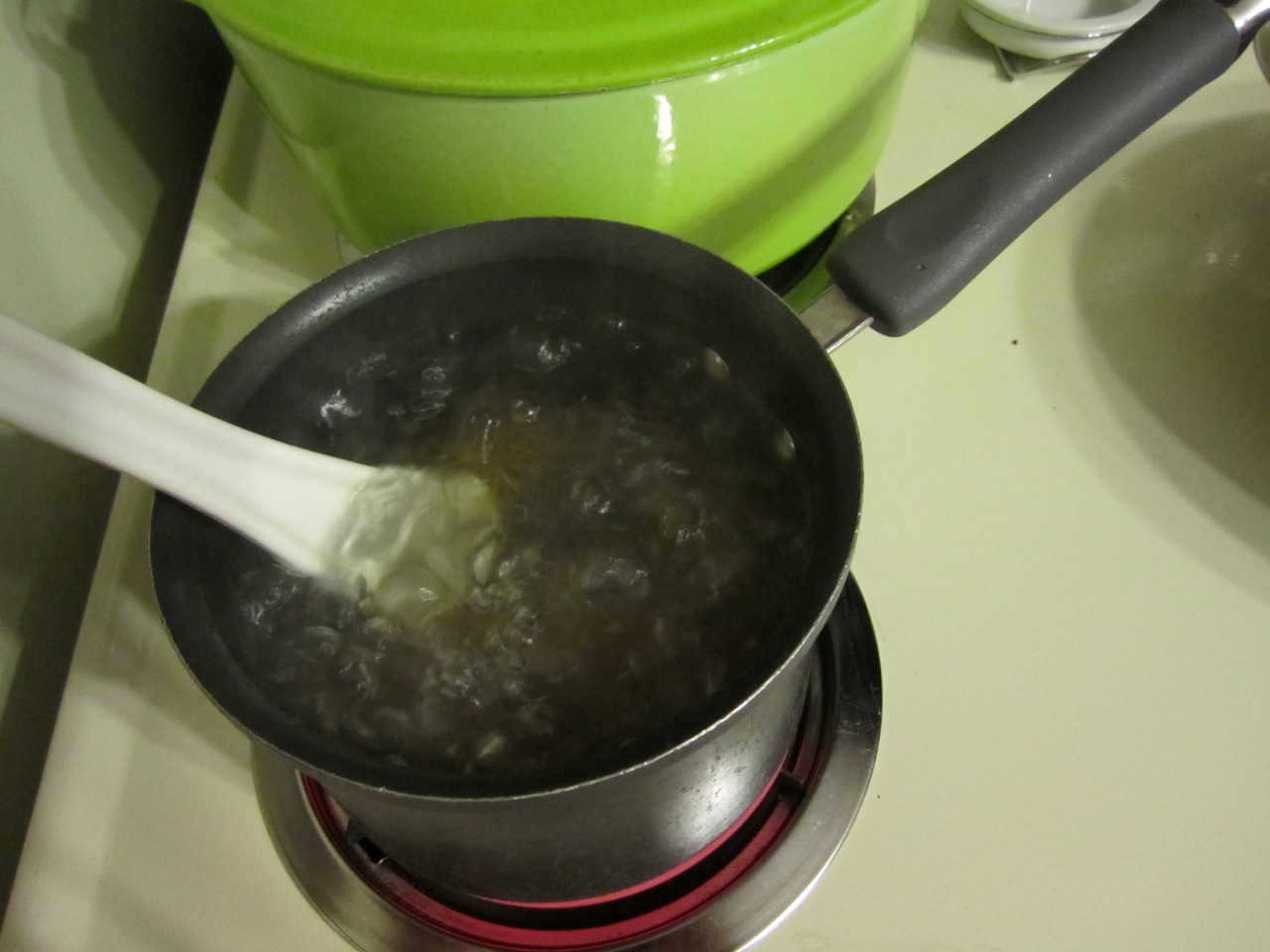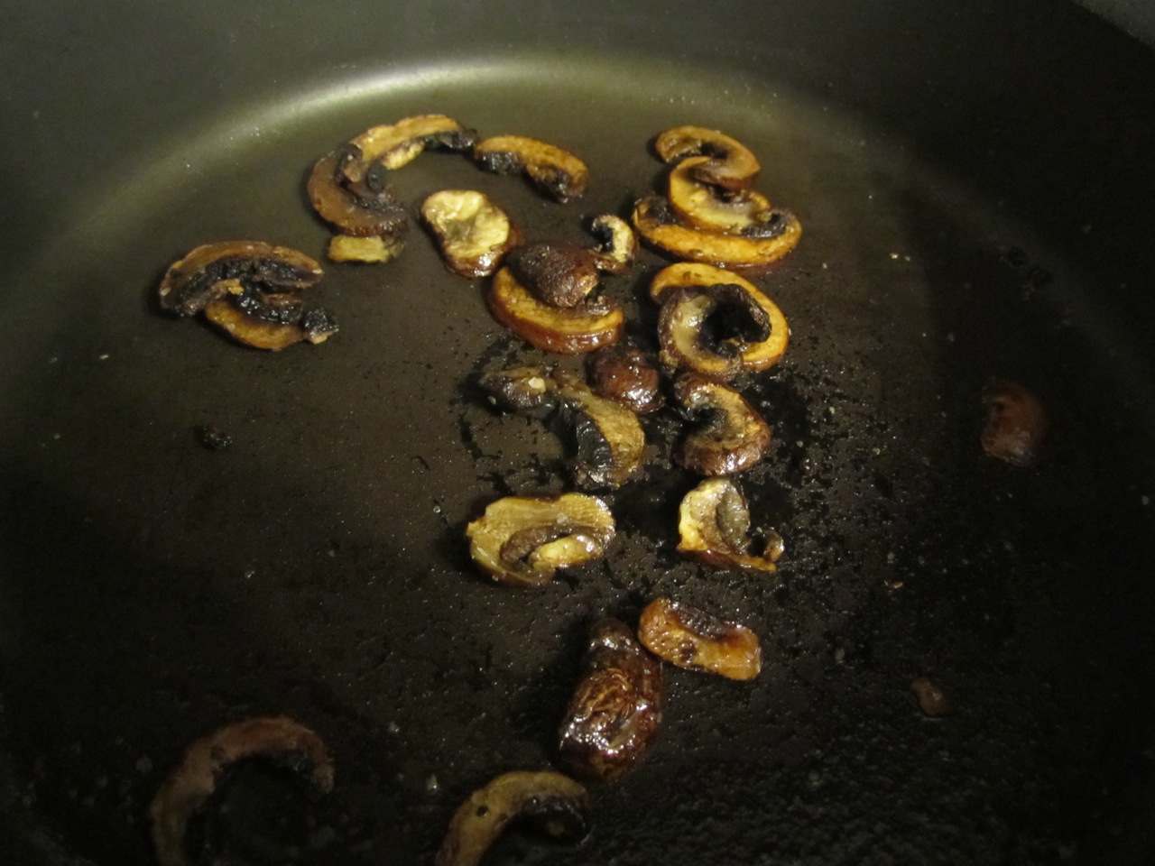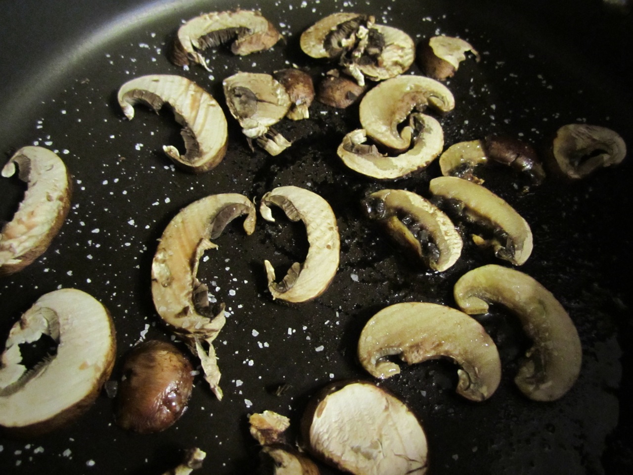 Warm half a tablespoon of olive oil in a skillet [about five minutes] on medium heat and then toss in the mushrooms. Generously salt. (I only use non-iodized salt, because I don’t like the taste of iodized salt, plus I like the coarse grind.) The mushrooms will absorb the oil and salt and then release it with their water in a few minutes.