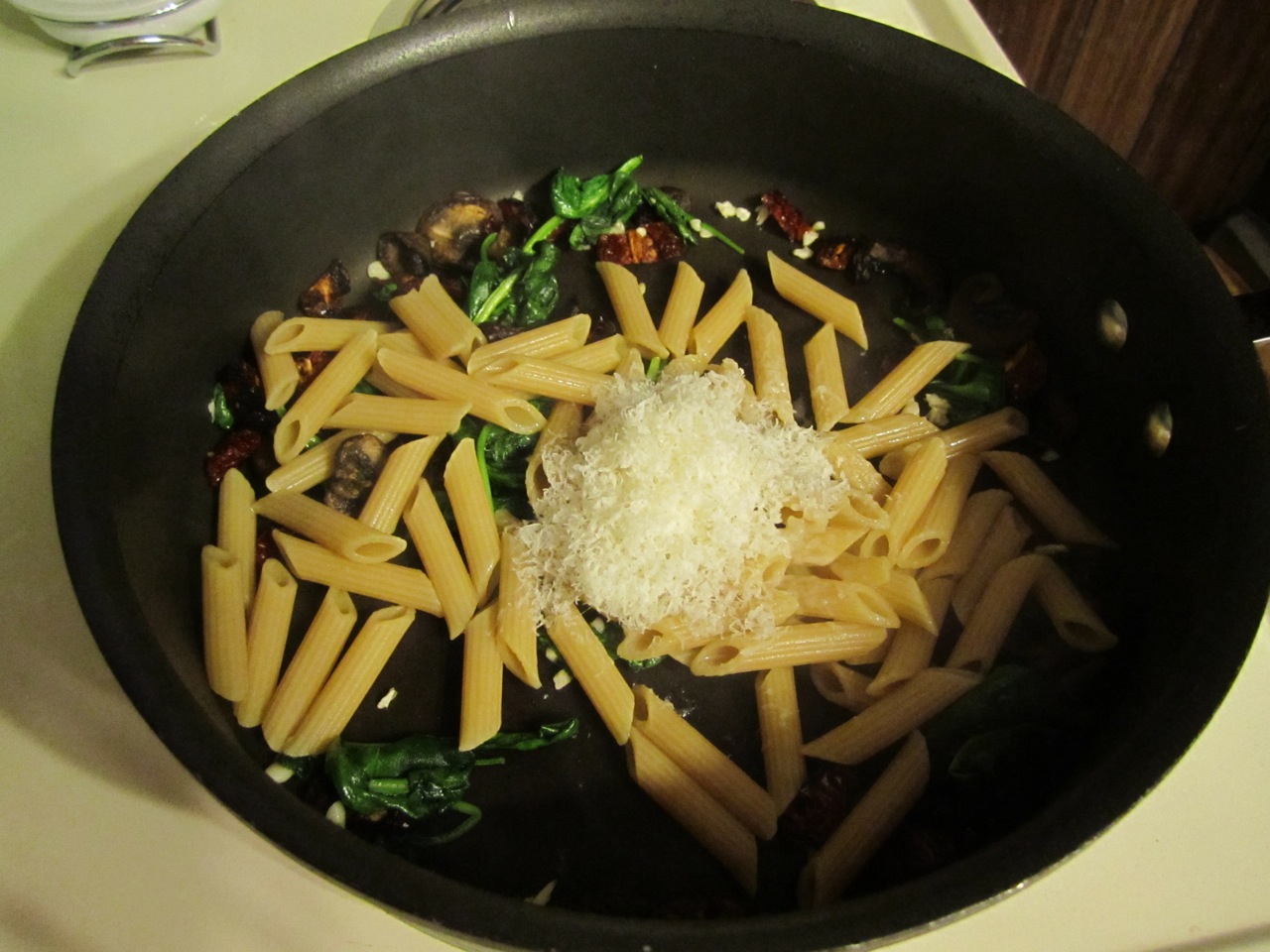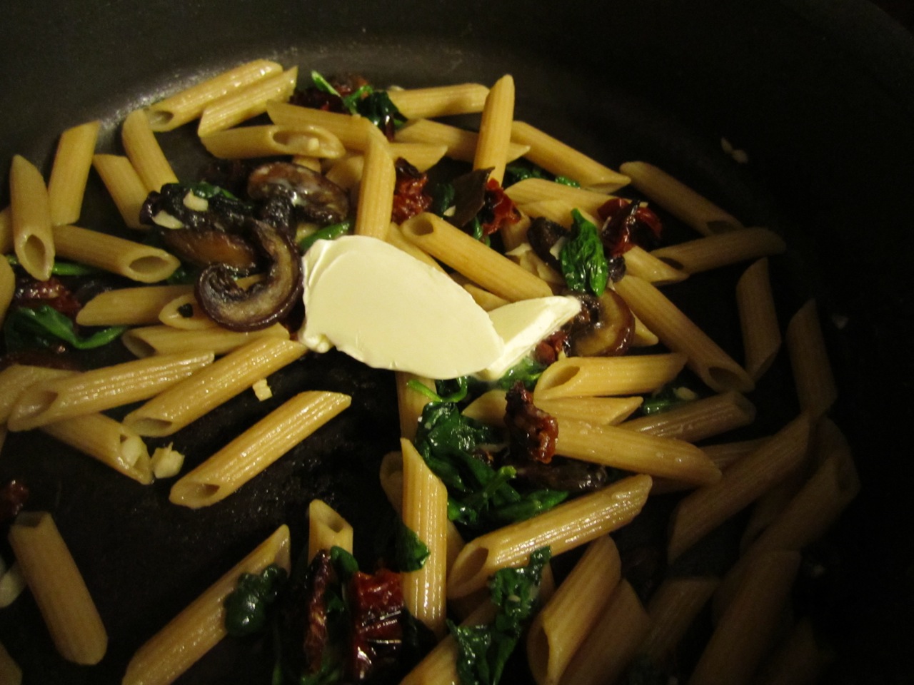 I’m not going to go into a review of the place, it was good — nothing earth-shattering, and I’d happily go back, but this blog post is about a dish I was inspired to make at home based on their Penne Alla Sophia. Penne Alla Sophia is penne pasta with mushrooms, sun-dried tomatoes, and basil all tossed in a cream sauce. It was okay tasting, really nothing spectacular. The cream sauce was very heavy, but the ingredient combination was quite nice. (If you do go to Sam & Gabe’s be sure to get their chocolate and espresso torte — divinity on a plate.)