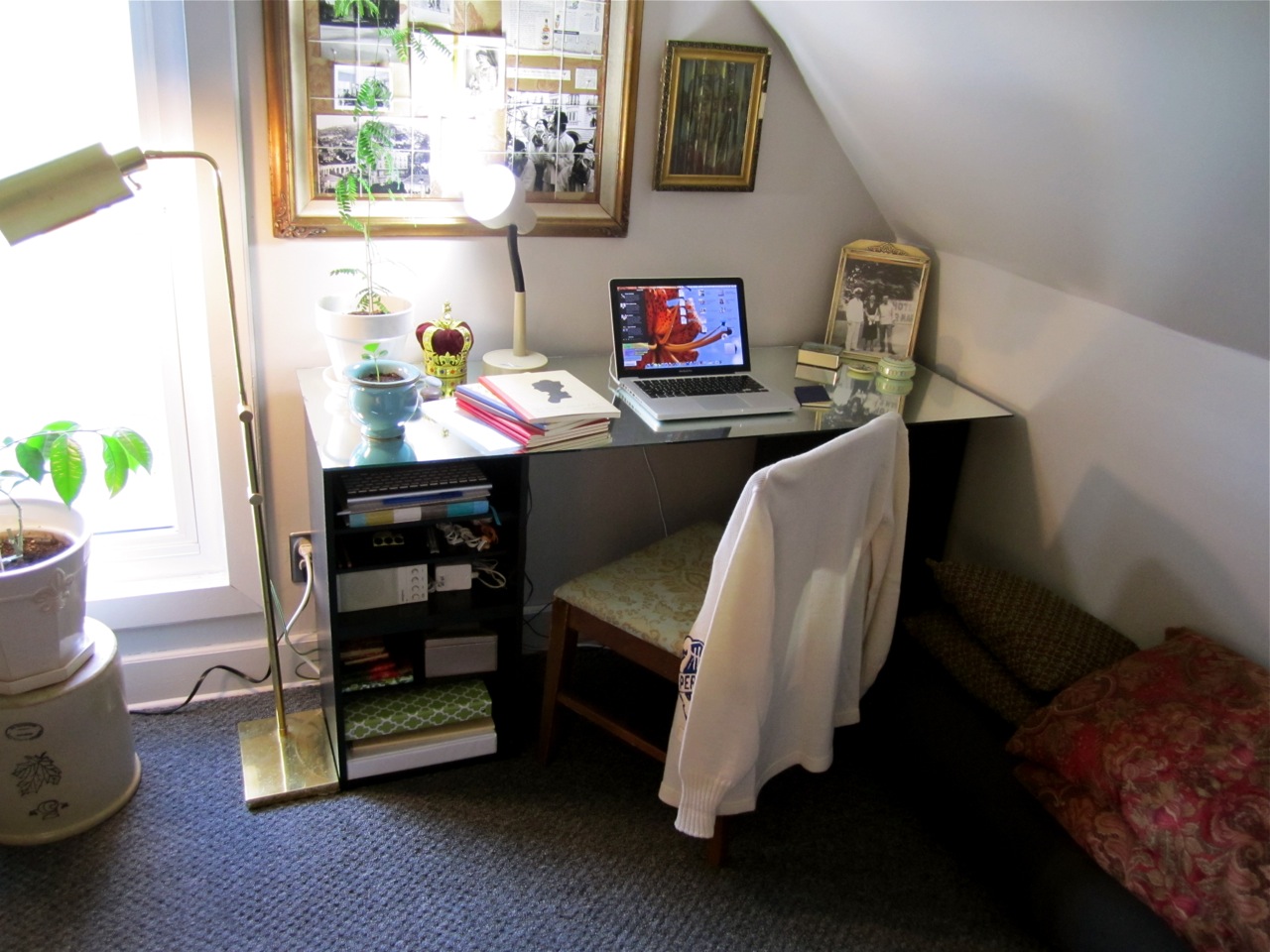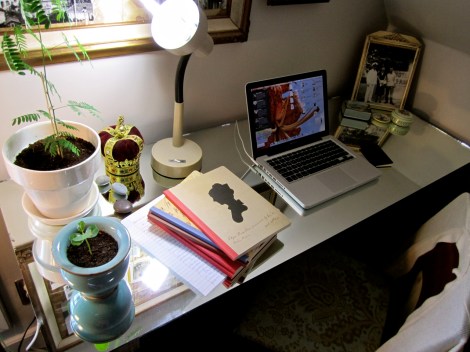 My desk is rather full, but it is very wide, so it doesn’t feel cluttered when you work at it. In the blue pot is my sea grape, a very slow growing plant that I began from a seed I found on the Gulf of Mexico. In the white pot is a gorgeous tree. I have absolutely no idea what it is, but I started it from a seed as well. It came from Old Key West Resort at Disney World. You can also see my tiny crown. The plant light brings a very realistic faux-sunlight to my room when the day sadly transitions to night and is good for my mood. The journals contain parts of my two novels, Terrible Miss Margo and Hôtel Ker-Maria, with which I hope to snatch my fortune. The journals on top are by John Derian from when he did his collaboration with Target. I was obsessed with those products and wish that I had managed to get a bit of everything. I only found the journals and plates. Sad. The others are by Moleskine, a company I adore and would love to be the spokesperson for when I am famous. Other companies that should consider me for an advertising blitz are Swatch and Nespresso. At the far end is my collection of trinkets and photos that help me get in the mood for working on Hôtel Ker-Maria.