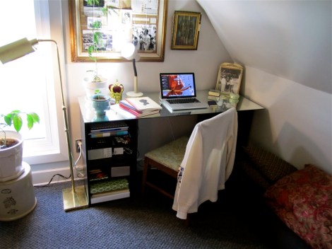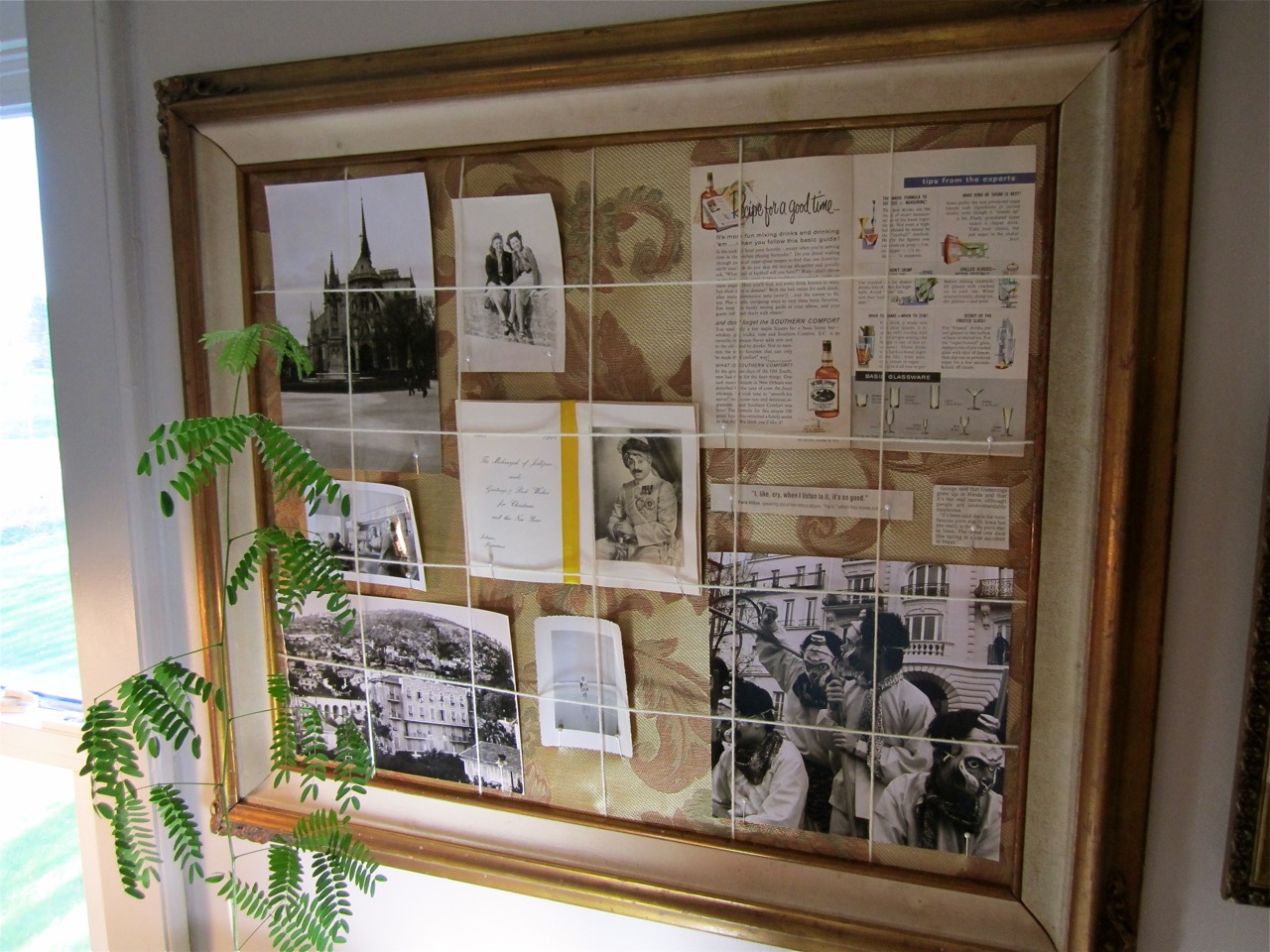 You can get a better sense of how tall my tree has grown. I love it so much, I don’t know what I will do when it is too big to fit in my room. I fashioned this bulletin board out of an old frame that I found in the garage. I stretched a bit of scrap fabric over a piece of cheap foamcore, wrapped some wool yarn around it, and voila! I stuck in pictures that would be motivating to me, newspaper clippings that I find amusing, such as the one detailing the death of Iowa’s only porn star, and a recipe for martinis.