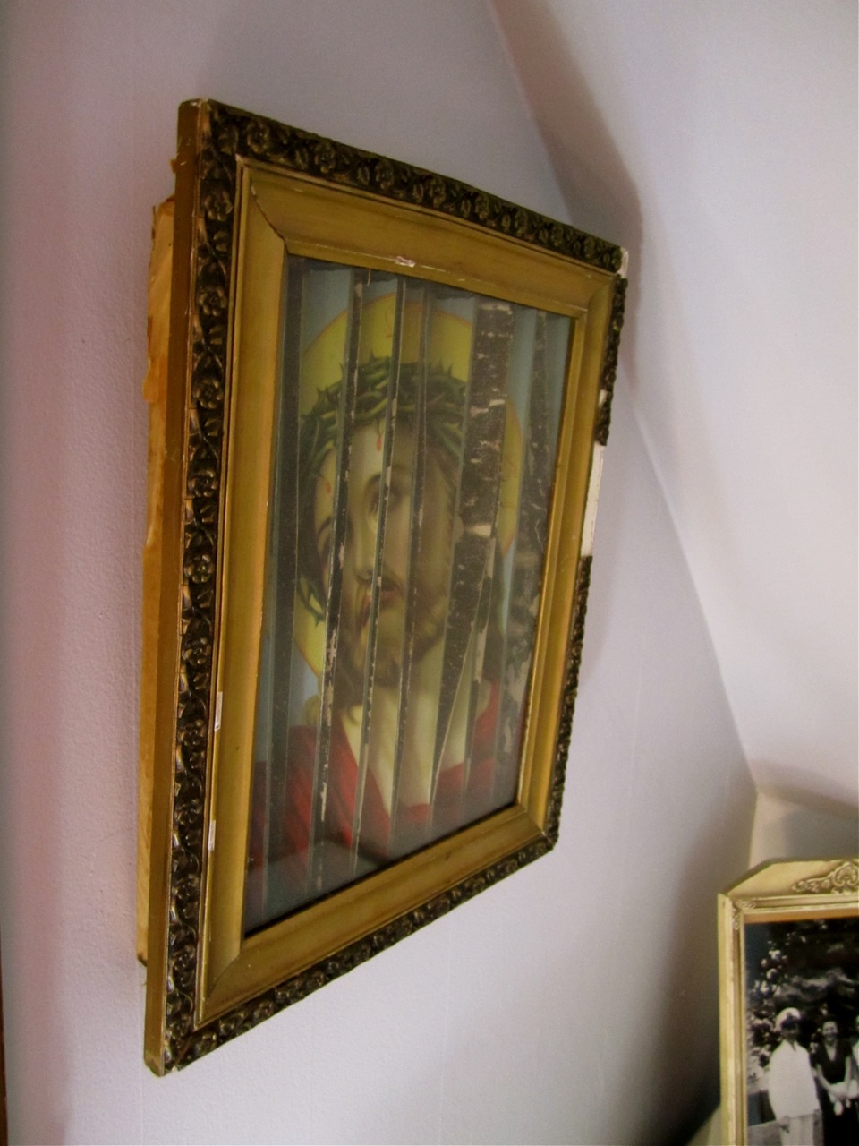 Here’s a closer look at my gilt mirror that I stole from the house of a dead woman. Oh shucks, I didn’t know I got in the shot… I really love this mirror. It reminds me of sexy tin ceilings, except that it is on my wall. The glass is spotty and warped in places and did I mention that it’s gold? Well, not real gold, but that isn’t important.