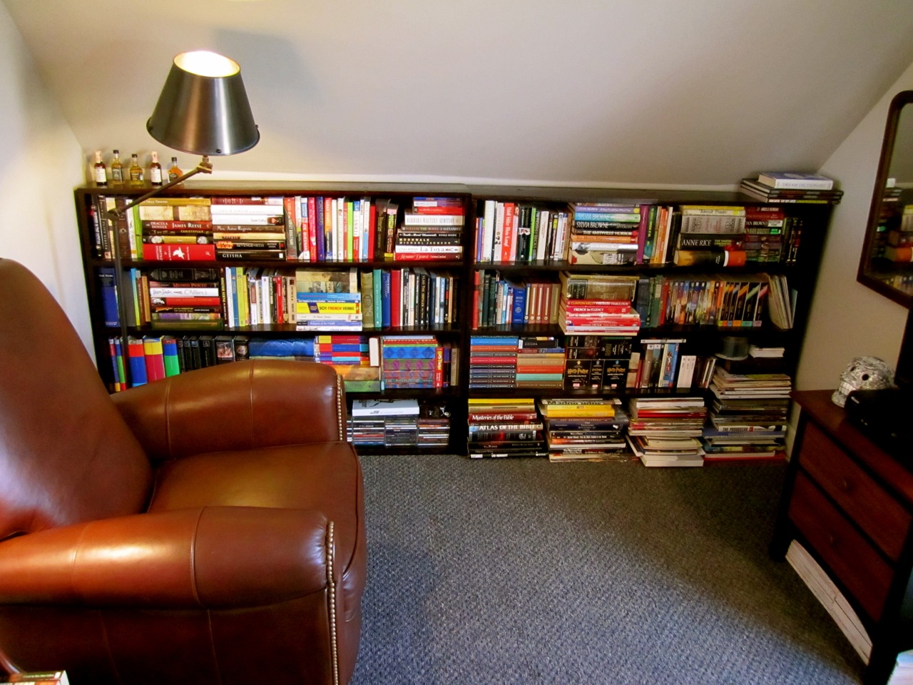 Here is my ‘living room.’ The leather recliner was a gift from my Father. Being a vegetarian, I am not thrilled about the leather, but the chair is beautiful and comfortable. Next to the end table is my space heater, which I will not live without. My room must be 70° minimum. Can you tell that I love lamps?