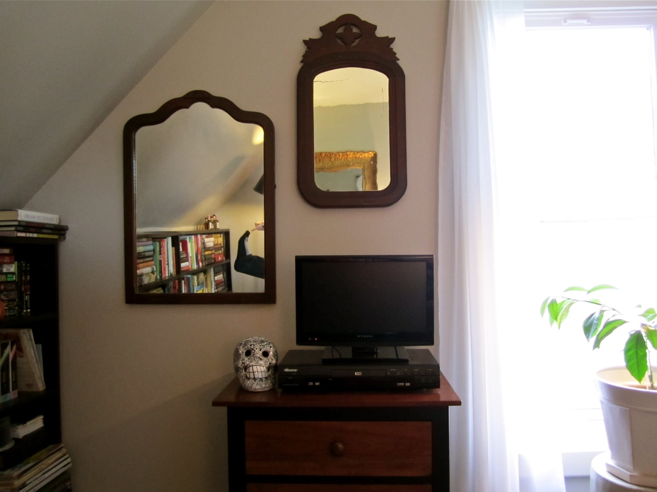 Here are some more of my mirrors! Discerning viewers will see that I am modeling H2T. (Only discerning viewers who watch America’s Next Top Model will get that one.) The mirror on the left belonged to somebody in my mother’s family and the one on the right to somebody in my father’s. My great-great-great grandparents maybe? It is from before the Civil War. You can also see my Día de los Muertos skull and my tiny television. I don’t watch much television, so it’s perfect for me. I had the curtains custom fitted to my window with a very light, gauzy fabric that reminds me of the beach.