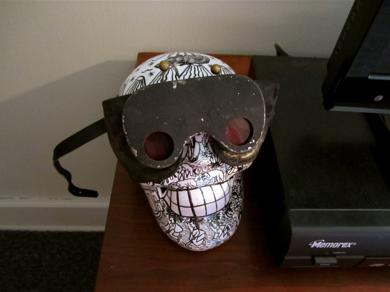 Here, I’ve dressed my skull up in a pair of odd goggles that I bought in an antique shop because they reminded me of something Lady Gaga would wear. I did some research and they were supposedly used in induction rituals in societies like the Masons and college fraternities. Sexy.