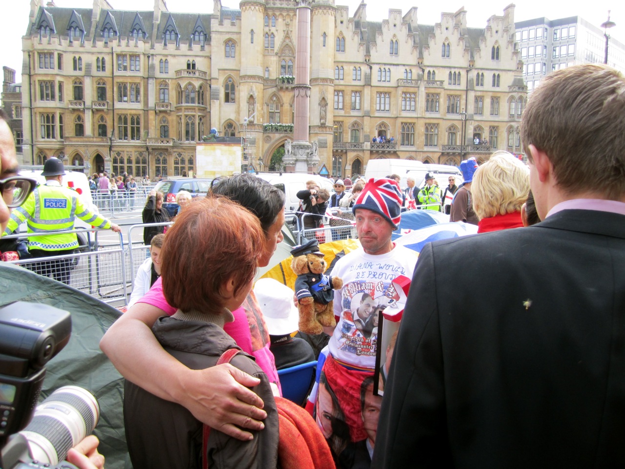 With the Royal Wedding tomorrow, we decided to go out and walk the route, pick a good place to watch and peek at all the lunatics that were burning with Royalist fervor. Or now that I think about it, they just wanted to be on the news. Good on them!