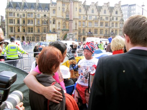 This man is crazy. The police woman told me that he is well known to them. He is not dangerous, just out of his mind. He was the first person to wait for the wedding and was profiled on Good Morning America. Because of this, he is officially the first celebrity spotted.