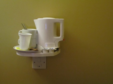 The hotel, The Trebovir, is absolutely charming. Spacious, by European standards, with very modern amenities and a plethora of outlets. A big step up from the last hotel I stayed at here, The Tavistock Hotel. Nasty dump of a place. Plus, they have a tea kettle built into the wall. Chic!