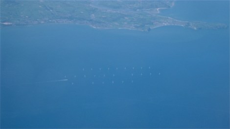 We were served breakfast, then. I believe it was some kind of egg sandwich, but I’m not sure what it was really. It was nothing but sustenance, nothing that needed to be tried again. As I munched on my breakfast and washed down the dry, chewy bread with copious swallows of orange juice, I looked out over the water again. We had left Ireland behind and were nearing Wales. I was absolutely delighted to see wind turbines in the middle of the Irish Sea! What a great idea. Few things make me more excited than air turbines. I’m serious.