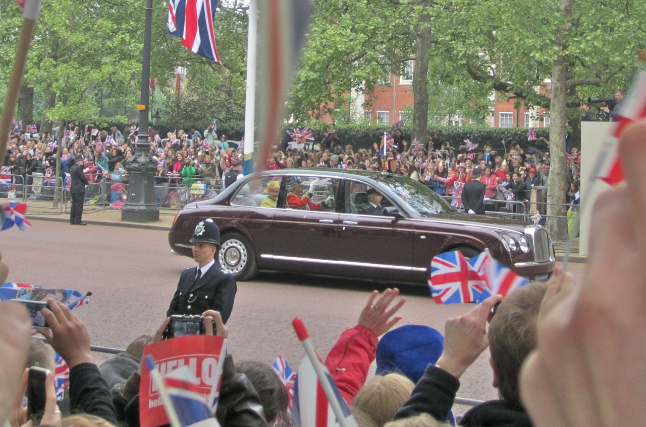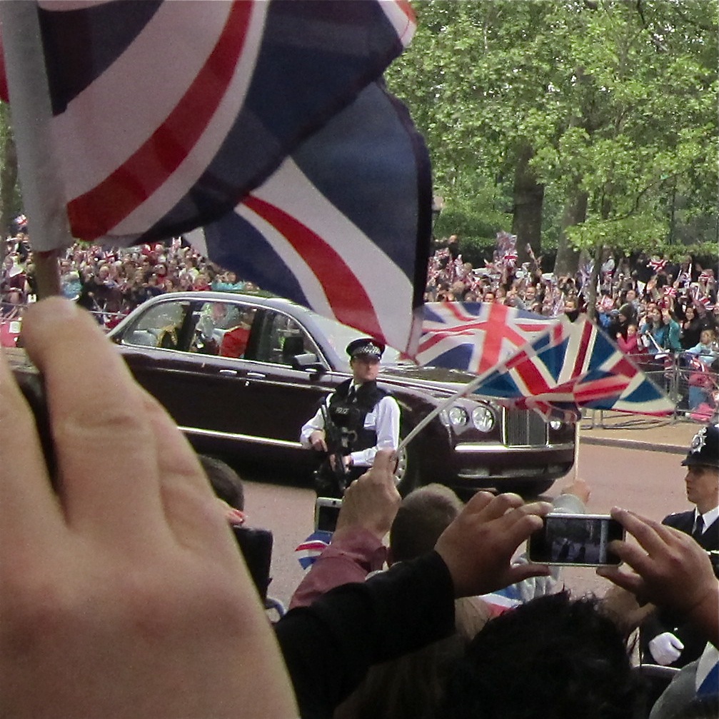 At the end we had another pretty decent spot to view the Royals as they came down in their horse-drawn carriages. I guess I did, at least. She still saw nothing and was getting more and more pissed. A clopping of horses and a scream from the crowd alerted us to something exciting, and out of the tunnel between Westminster Abbey and Buckingham Palace popped up the newly titled Duke and Duchess of Cambridge (Prince William and Princess Catherine) emerged. I saw them clear as day, my camera lens did not.