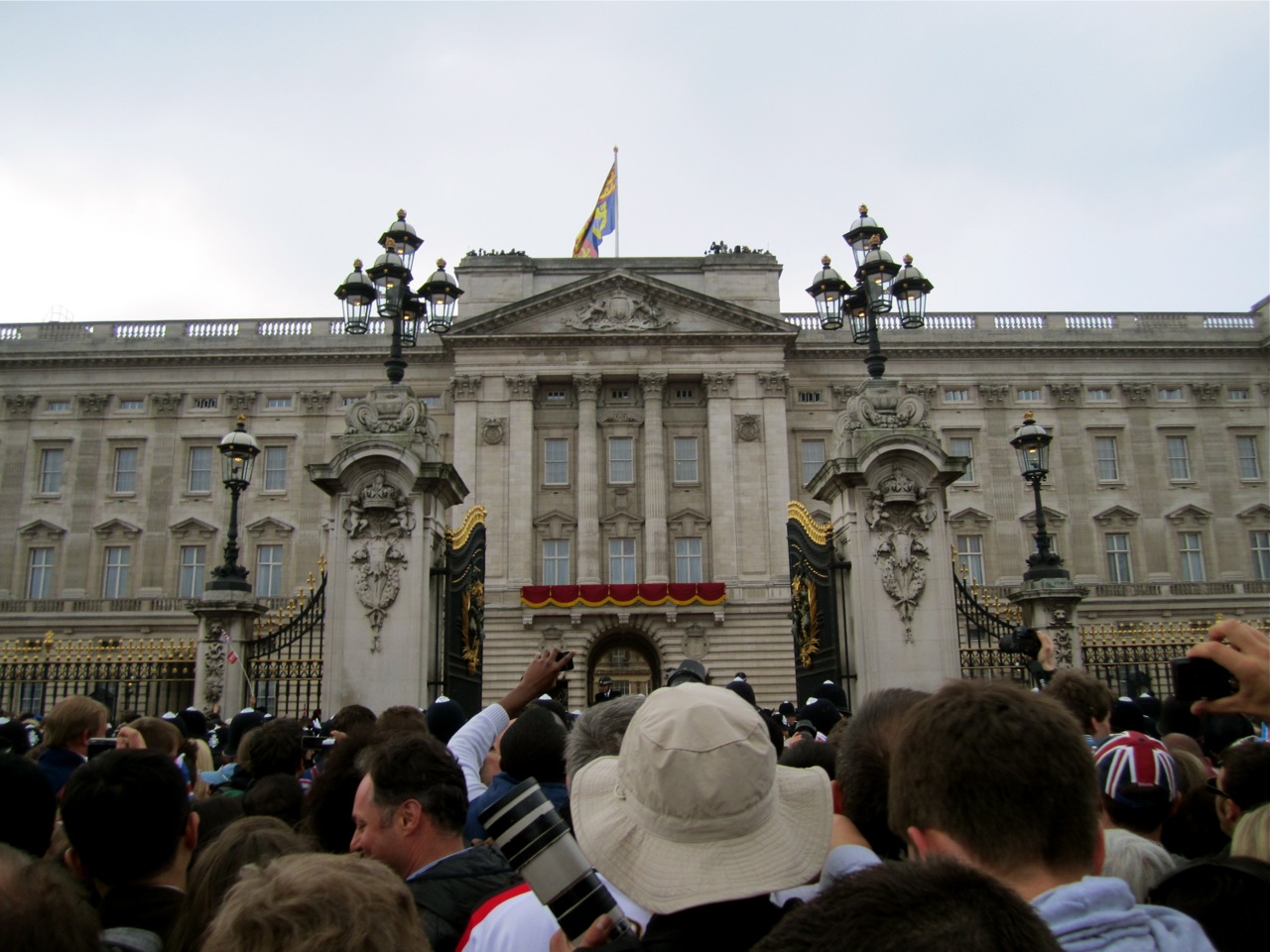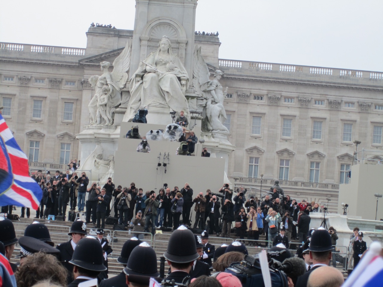 Slowly, we advanced on the Palace. It reminded me of the French Revolution when crowds surged on the Palace of Versailles trying to abduct the Royal Family, or worse. If the crowd had become unruly, there was no stopping this great wall of people. We were like a wave rushing towards the front gates. We were impatient and thrilled and each step forward was so much fun. We wove to the cameras, cheered as the jealous folks on the street shouted to us, and commented to each other on our good fortune. When the Palace came into view it was absolutely amazing. Nothing in my imagination was even close to this reality.