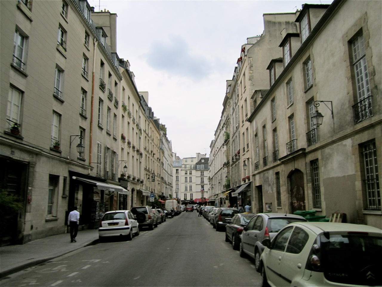 The Place des Vosges is the very first example of a public square in a city. It is a perfect square lined on each side by an allée of trees that provide a tremendous amount of shade. In each corner is a fountain and in the very center is a statue of one of France’s kings on horseback. I forgot which–George something or other?