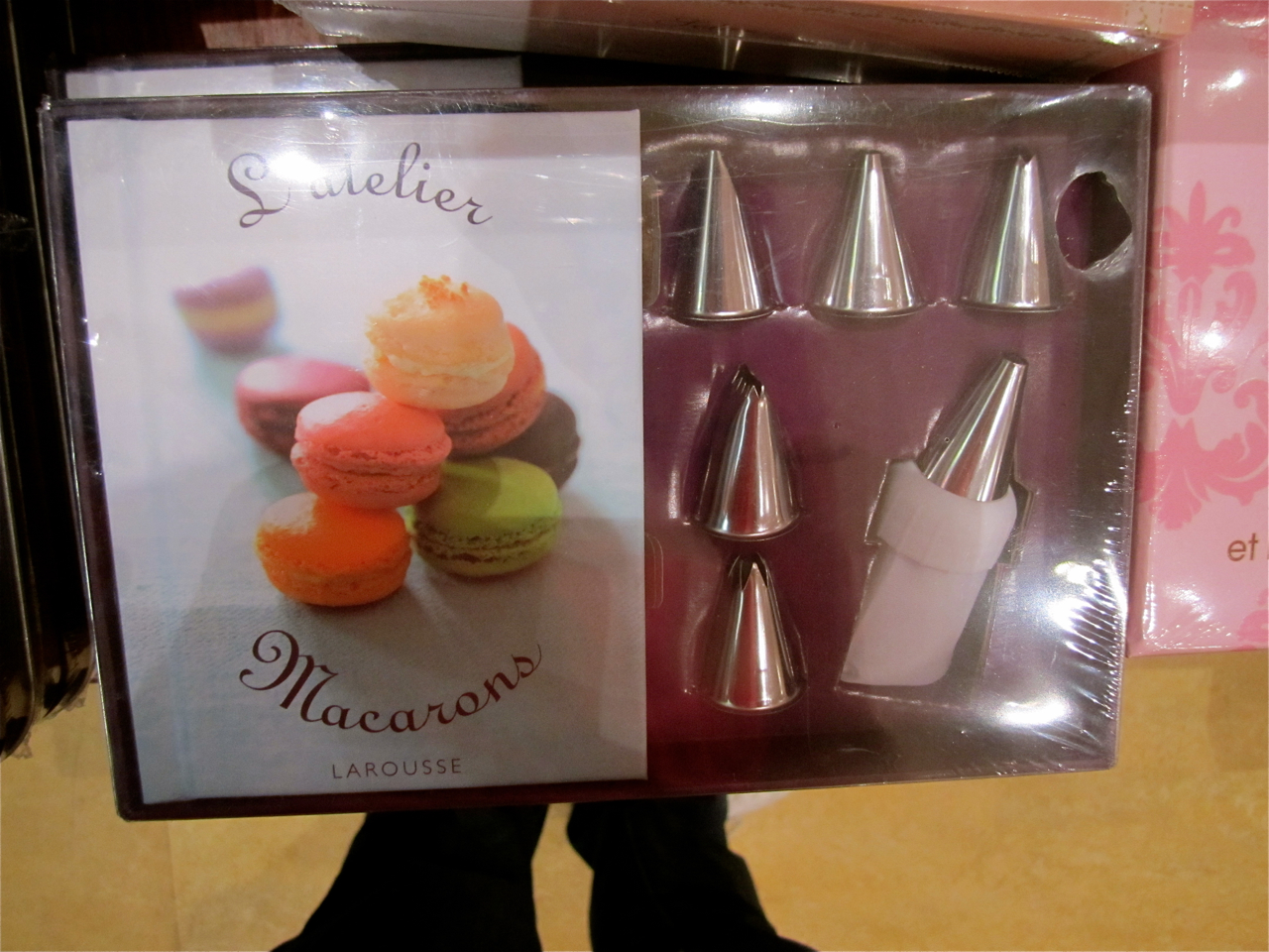 The macaron craze, as I said before, is in full force with crappy recipes filling every window. I have stopped trying them already as they are all really, really bad. I will now only eat Pierre Hermé as his are the only ones that I find comparable to my own and worth the hefty price. In the bookstore there were a handful of books on the subject and I flipped through them and will probably go back and buy a few just for inspirational ideas–not for the recipes, because surely they are of poor quality. This kit was particularly intriguing to me because of the quantity of pastry tips. I have made a lot of macarons in my life, hundreds maybe thousands, and I have used exactly two simple circle tips. I don’t know what they could possibly use the others for. The macarons on the cover don’t even look that good, it’s like they aren’t even trying.