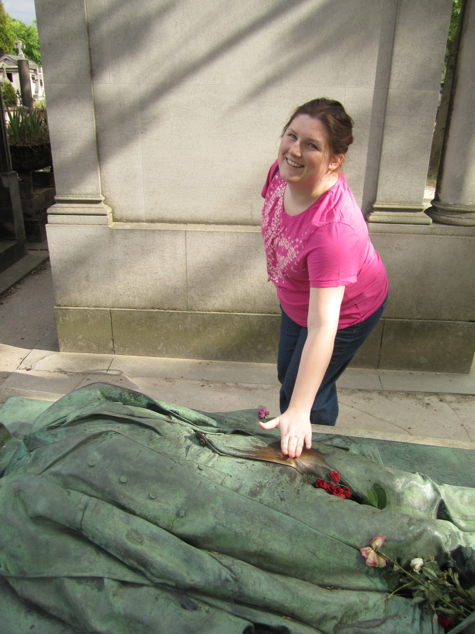 It was getting late and the cemetery was going to close in about twenty minutes, so we headed towards the gate and towards the last memorial we wanted to see, which is renowned for its eccentricity–the tomb of Victor Noir. After he was shot, it is alleged that certain parts of his anatomy refused to die…if you get my message. So, local legend has it that you can literally rub off a bit of his virility onto yourself. Kiss him to find a lover, touch his toes to become pregnant. Touch other areas for pleasure. Let’s have Jessica demonstrate.
