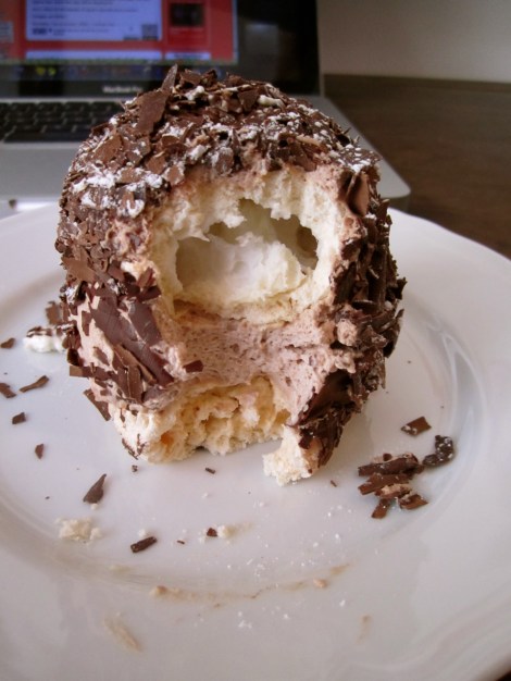 Now it was time for my meringue. I looked at it awhile. I had never seen anything like it. I wasn’t sure what to expect, but I did not expect to have a foodgasm. I have not had many of them, but this was exceptional. Crispy, perfect meringues, with chocolate cream in the center, with more cream on the outside and then rolled in more chocolate. Sweet Jesus, I’m drooling right now thinking of it. I need more. I’m going back for all the flavors…in multiples. Look at it! LOOK AT IT!