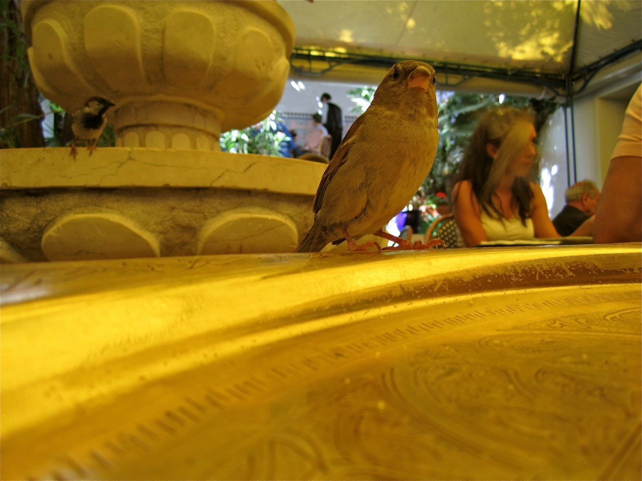It was a beautiful area, the floors were done in herringbone marble (I know! I about died), there were gorgeous tiles all over the walls and there was a fountain right in the middle where birds were drinking and bathing and stealing nibbles from the people. They aren’t shy, they will fly right up to your table and take food from your hands. Jessica delighted in pretending that she was in Beauty and the Beast again.