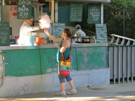 The shortcut was closed for some reason, so we wandered through the manmade grotto with a waterfall and then took the long way out. Jessica shouldn’t have minded too much though, because she found cotton candy.
