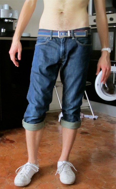 I immediately stripped myself of the shirt and got creative. My jeans quickly became relatively attractive man capris. They were nothing to be ashamed of, a bit obvious, but they were much cooler.
