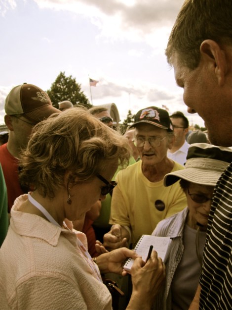 A brave, wise woman in the middle of the crowd shouted in a booming voice. “GO HOME, SARAH!” Another marvelous moment. Sarah just continued smiling and looking out in the crowd. An admittedly clever man replied, “YEAH! GO HOME, SARAH! GO HOME TO WASHINGTON!” The crowd was in an ecstasy, but I had had enough. We had more important things to do than watch sleazy politicians–we had pie to eat.