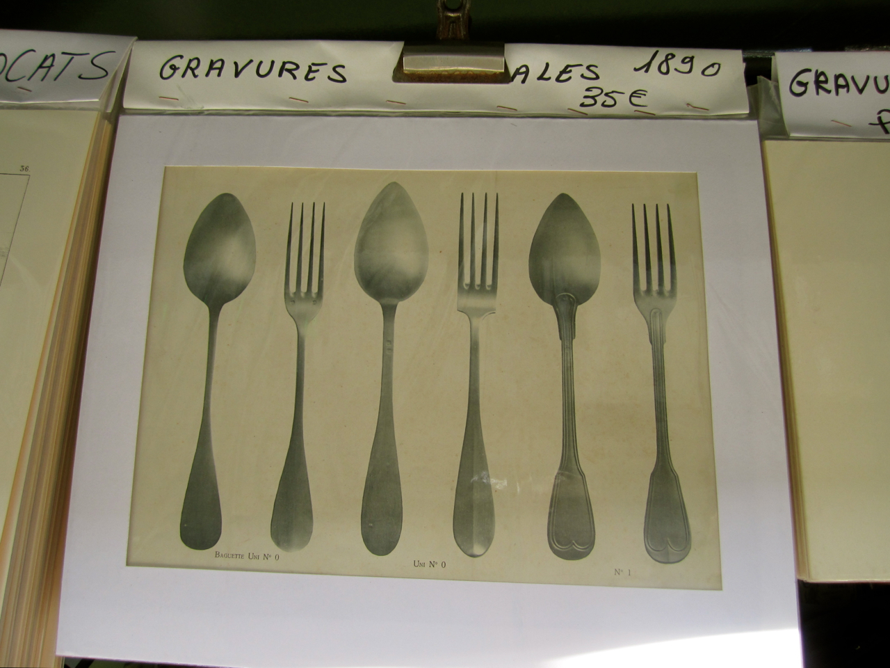 One stall that was particularly interesting and particularly expensive was devoted to cookbooks. There was one from 1836 and I desperately wanted it, but it looked like it would fall apart when you opened it and it was fifty euros. I also wanted this set of original engravings of flatware. I have a huge collection of forks and spoons and such and I would have loved to put this collection in my future kitchen, but I didn’t feel comfortable spending three-hundred euros on the lot of them. I hope that I can find reproductions someday or something similar because they were truly quite lovely.