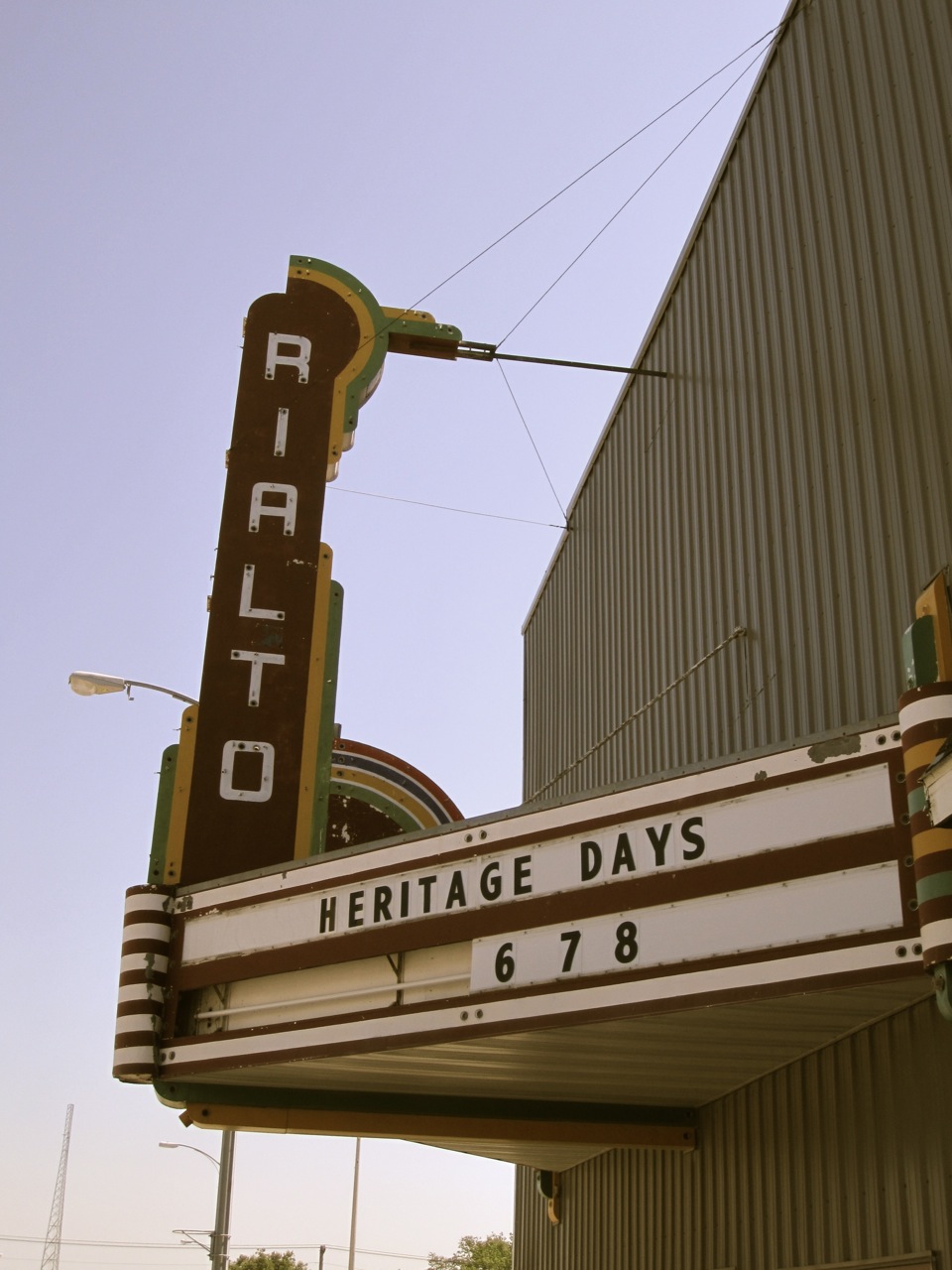 [Marquee of the old theater. The lovely bricks are covered in tin panels, which is hideous, but is probably for the best until somebody can afford to tuck and restore them.]