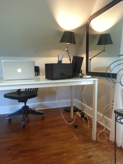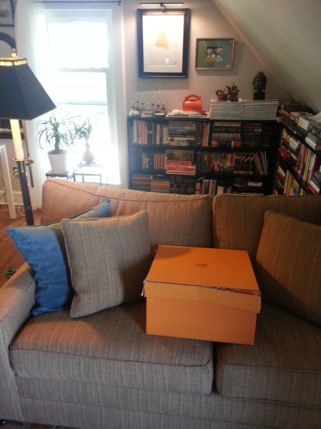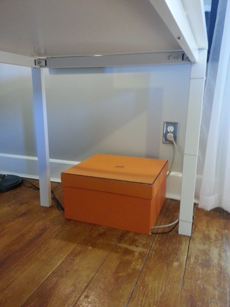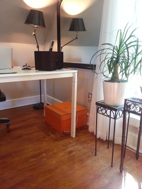 SWEET BUDDHA, NO! NOT NEXT TO MY RECLAIMED MID-CENTURY MODERN CHAIR! (I’m difficult to live with.) I’ve known for some time that I had a problem, but I didn’t want to deal with it. I couldn’t think of a solution. I thought that I might somehow attach a power strip to the table, but I didn’t think that would be very nice, so I left it alone. Today, though, I could deal no longer, so I tried to sit on the couch. I couldn’t though, because a giant Hermès box was sitting there. First world problems.