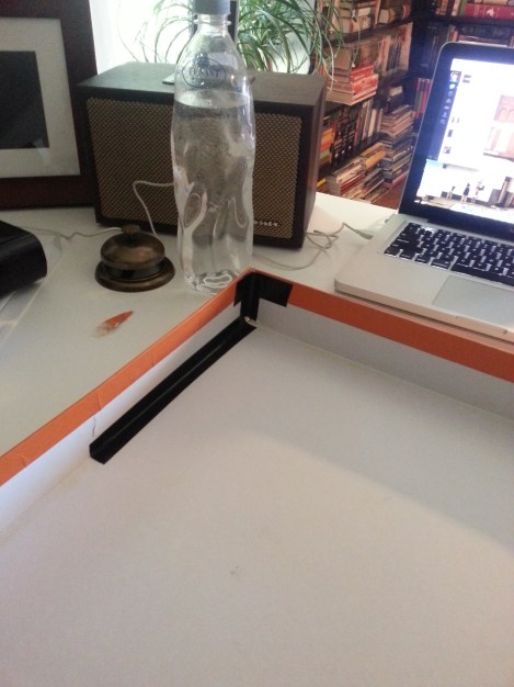 So, I looked at the box, then over at the cords, then back to the box, then over again to the cords and inspiration struck: the Hermès box could hide my cords! I wasn’t using the box as anything but a decorative feature, something I’m ashamed of. I think decorative items are, for the most part, wasted space. That’s why I hate lawn art and the majority of the homes I visit. I think that every thing you have on display should serve a secondary purpose. For example, my framed Allison Harvard watercolor doubles as a lamp. The piece of tin ceiling I “borrowed” hides an extension cord. A pile of old encyclopedias holds up my blu-ray player. The Hermès box was doing nothing. I decided to put it to good use.