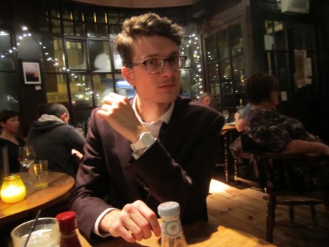 Jessica sniffed some food, so we got off the bus and went into a pub called the Maid of Muswell. Pubs are confusing because each of them seem to have their own rules and ways of doing things. Are you supposed to go to the bar or sit? At this one, you go to the bar. I had fondue. Not exactly typical pub grub, but nothing was. When did pubs get all fancy? You can get nicer food in them than you can at nice restaurants. Odd. Quite good fondue. Delicious when dipped with bread, with french fries, with onions, just with your finger.