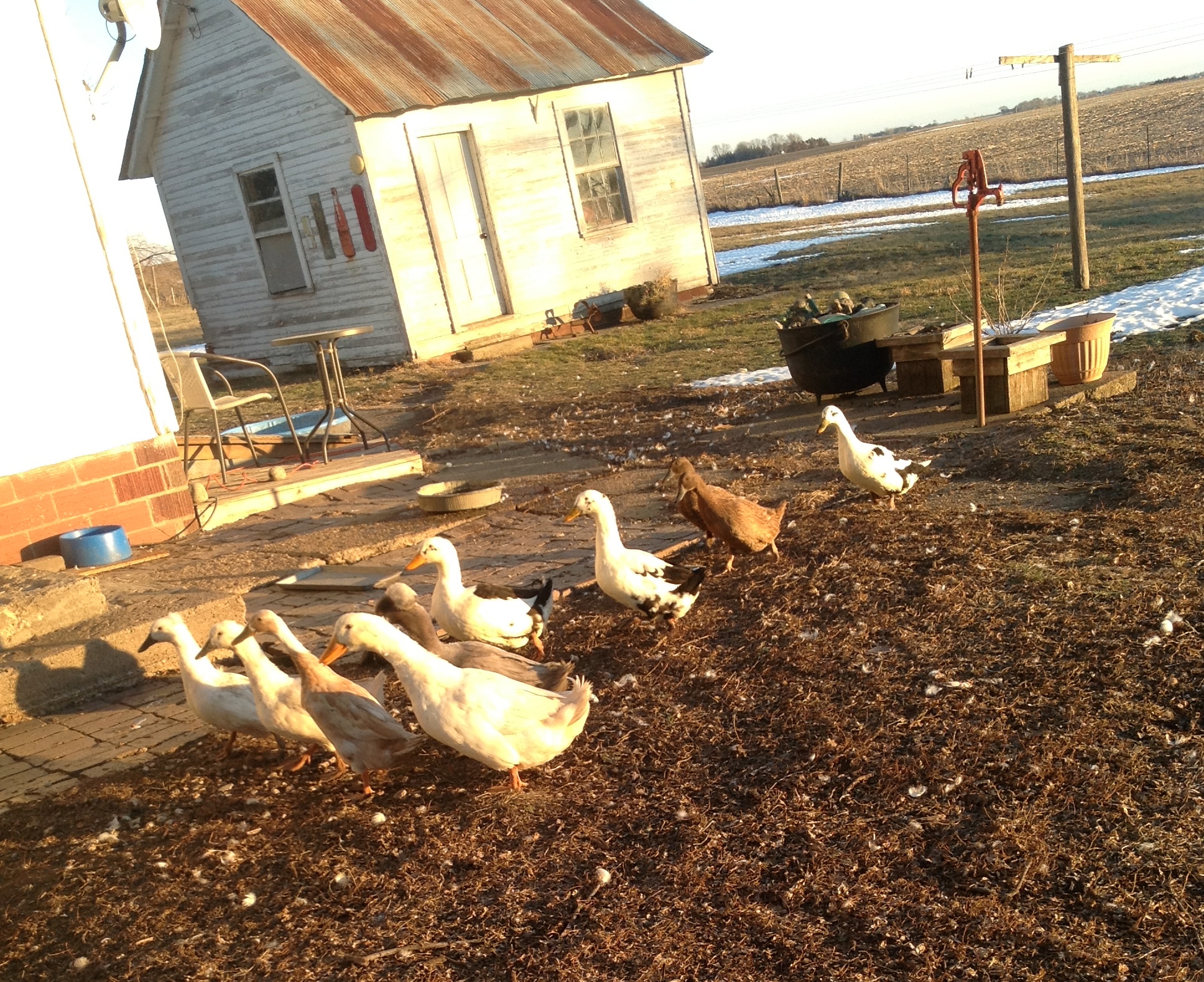 Last spring, we spontaneously bought six ducklings. They were awfully cute and they quickly grew into full fledged ducks. They weren’t inclined to stay in their yard and house, so they roam across the farm in a big herd. It’s amusing to watch, but they can get terribly annoying. Our ducks don’t gently quack, they scream as if being murdered. You can’t walk to the mailbox without being screamed at by their gang. They like to run at you, then they get scared and scream and run away. Watching them eat cat food is particularly delightful, they attack it. I used to be annoyed with them because they pooped all over the bricks I put in place this summer, but, they’re kind of cute.