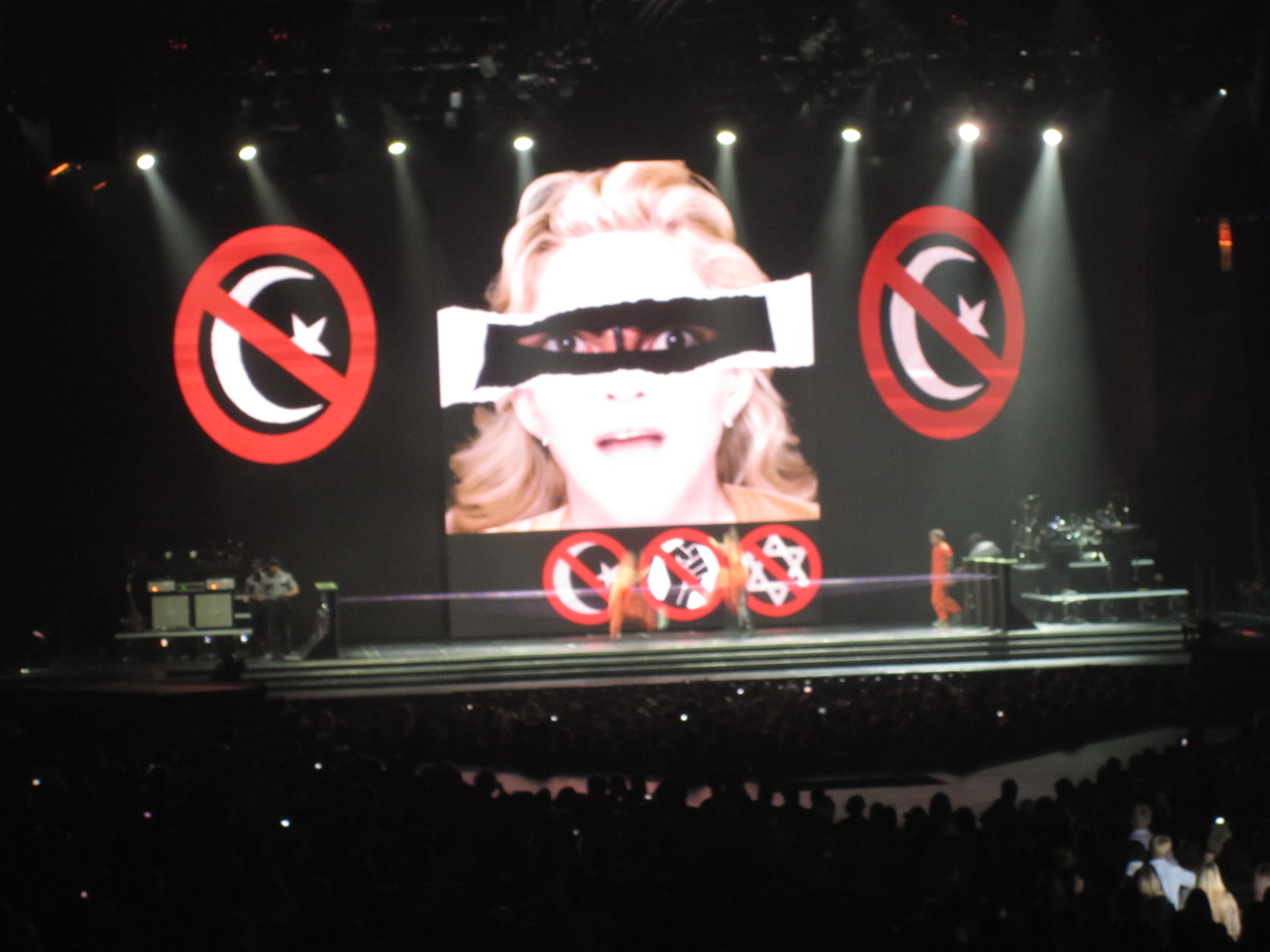 The first section of the concert was very dark and very violent and the crowd was definitely not into it. Even I admit that it was a bit too much. I understand the symbolism and the necessity to showcase raw anger so that the show can build into the euphoria that came later, but it seemed so very cruel. She sang “Girl Gone Wild,” “Revolver,” “Gang Bang,” and “Papa Don’t Preach.” During this entire time, she slaughtered her dancers a dozen times each. It was a violent orgy of bloodshed and I admit I wasn’t enjoying that much. I was still singing. In fact, I think I was the only person in the place that knew all the lyrics aside from Madonna. I tweeted a hilarious joke: “Madonna just got her guns out, and I don’t mean her freakishly toned arms.” And it had no retweets! Do these people not have a sense of humor?