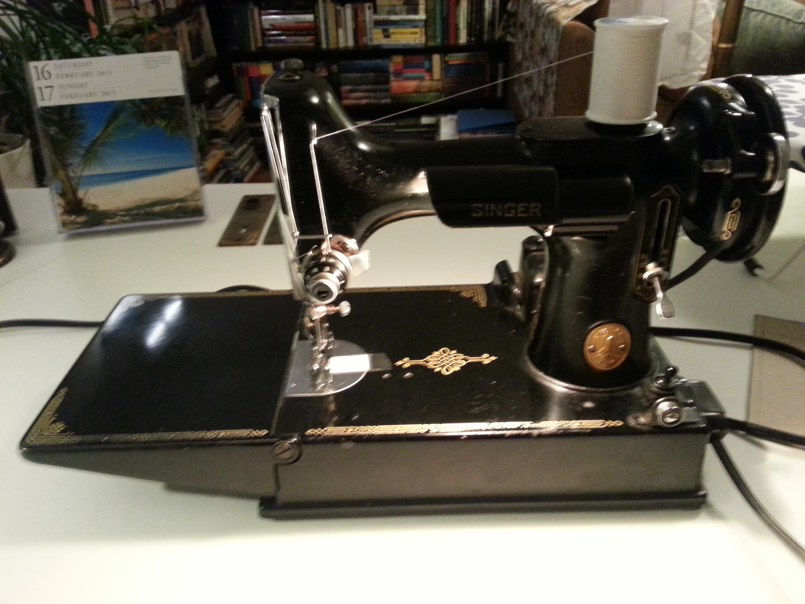 My grandmother gave this to me years ago. It was nonfunctional, so I had a sewing shop in Des Moines fix it up for me, but I think they did a terrible job as it never did work quite right and before long stopped working altogether. I was poor for a while, so I didn’t want to take it in for repairs. A couple months ago, I found some videos and instructions online about how to fix old Singer Featherweights and managed to get the thing running all by myself. I was ever so pleased. It doesn’t have a thousand fancy stitches, but it works so well. Besides–look at it. You can’t get machines like this anymore. Singer released a cool machine a year or so ago and I was obsessed: