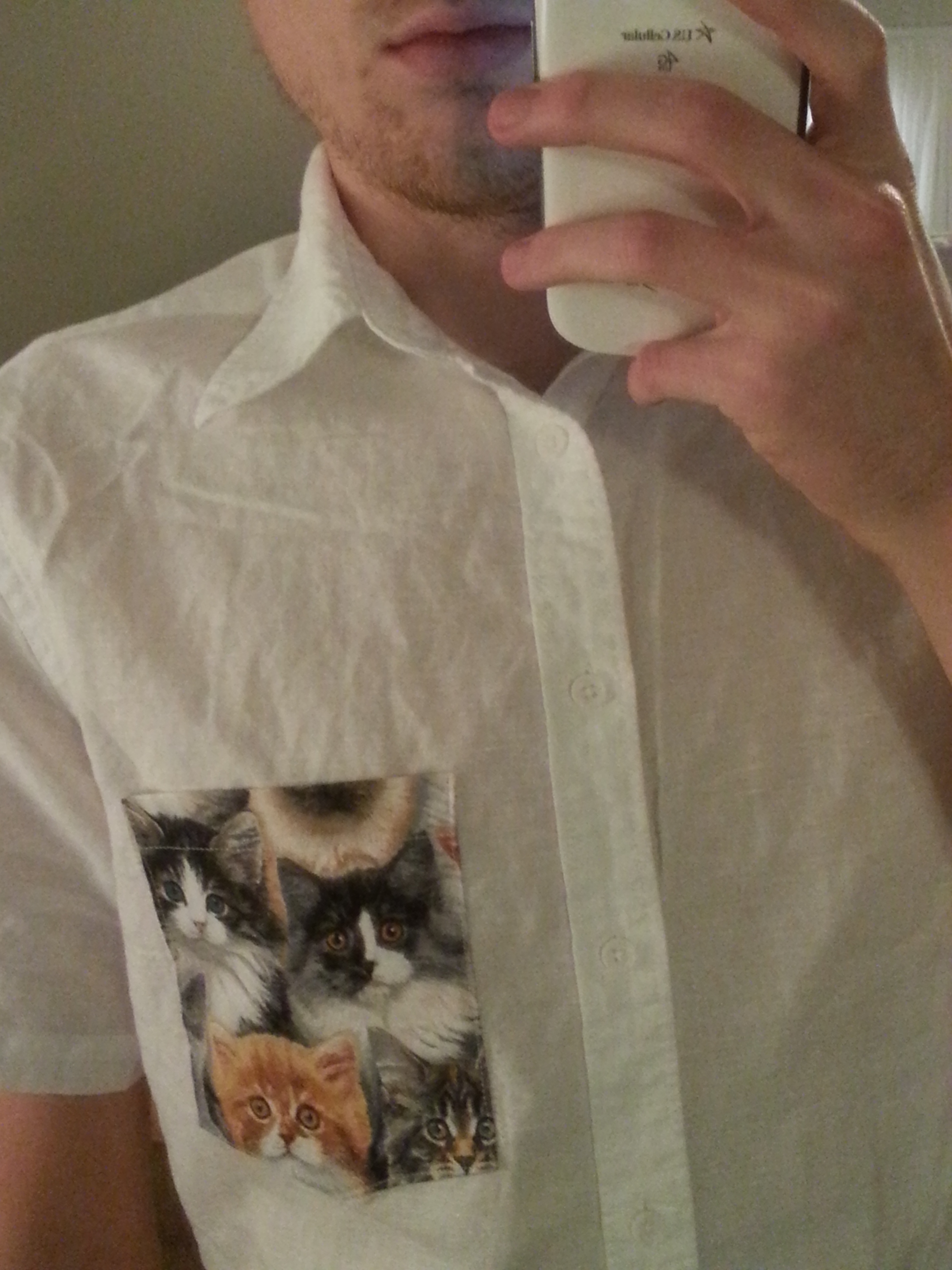 You never knew me when I was young, for which I’m infinitely pleased. I was hideous. I had long hair, I was fat, I had bad skin. Thank Buddha, I blossomed when I left my teenage years. Everybody always rhapsodizes fondly over their youth, but I have no desire to go back there. It was a boring and ugly time, plus I’d have to go back to school and I know that I would be the worst student now. I wouldn’t do anything! When I was in school, I had a 4.0 and I did all my work and I had no fun. Whatever. When I was in high school, I didn’t know how to dress. I’d spend days in jeans that holes ripped in them and oversized sweatshirts with the Cheerios logo emblazoned on them. I seemed to have gone out of my way to look disgusting. When I was a senior, I began to grow into my body, I guess, a bit more, and I started to feel better about myself, but I could hardly consider myself fashionable. But now that I’ve lived in Paris on several occasions, I’m catwalk ready all day every day. I love wearing nice clothes–I have a custom fitted suit, for Allah’s sake! Today I’m dressed like a sailor from the fifties. Yesterday, though, was a triumph. I blogged about my kitten pocket shirt earlier, but I’ll give you a refresher. I took the boring pocket off of a boring white shirt me whipped together a new pocket out of some gaudy kitten fabric. It was a goddamn triumph of fashion and I heard nothing but compliments about it. It was a delight to wear something that nobody else would wear. I like to stand out. Never used to, now I love it. Look at me!