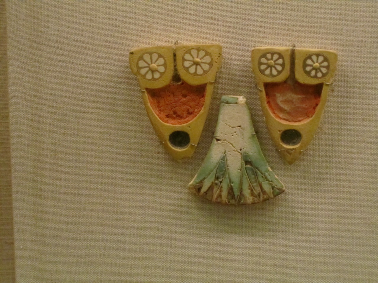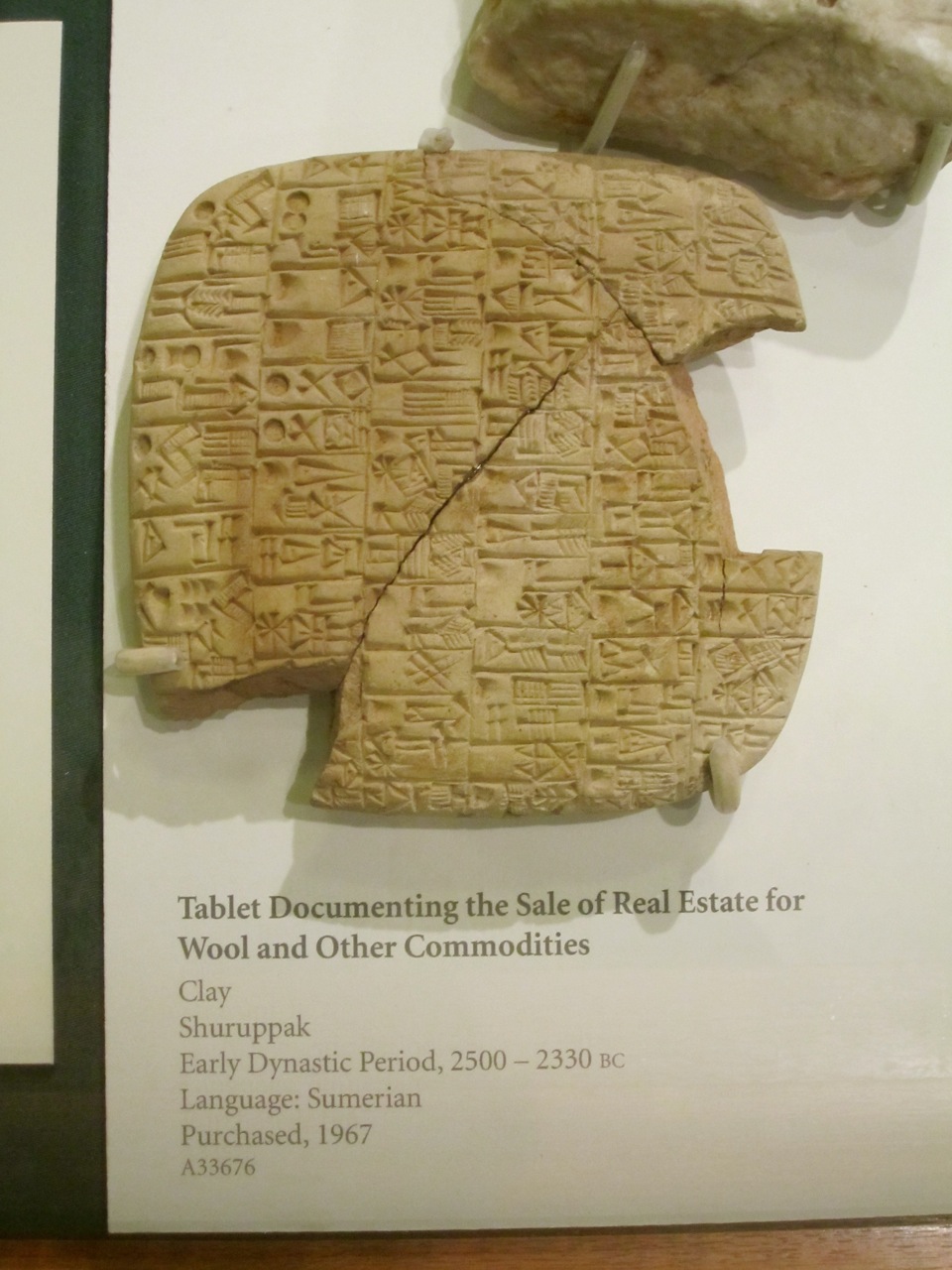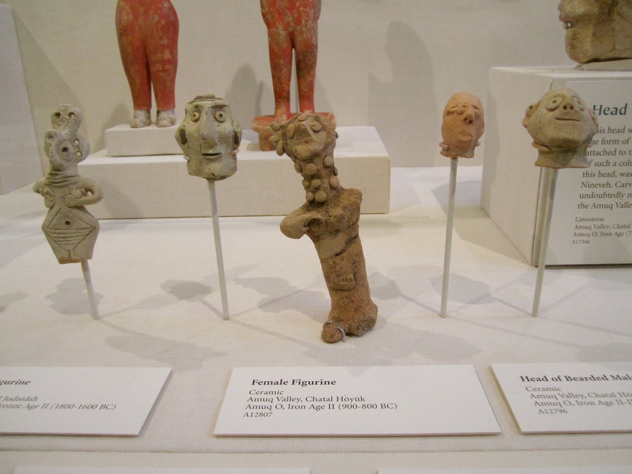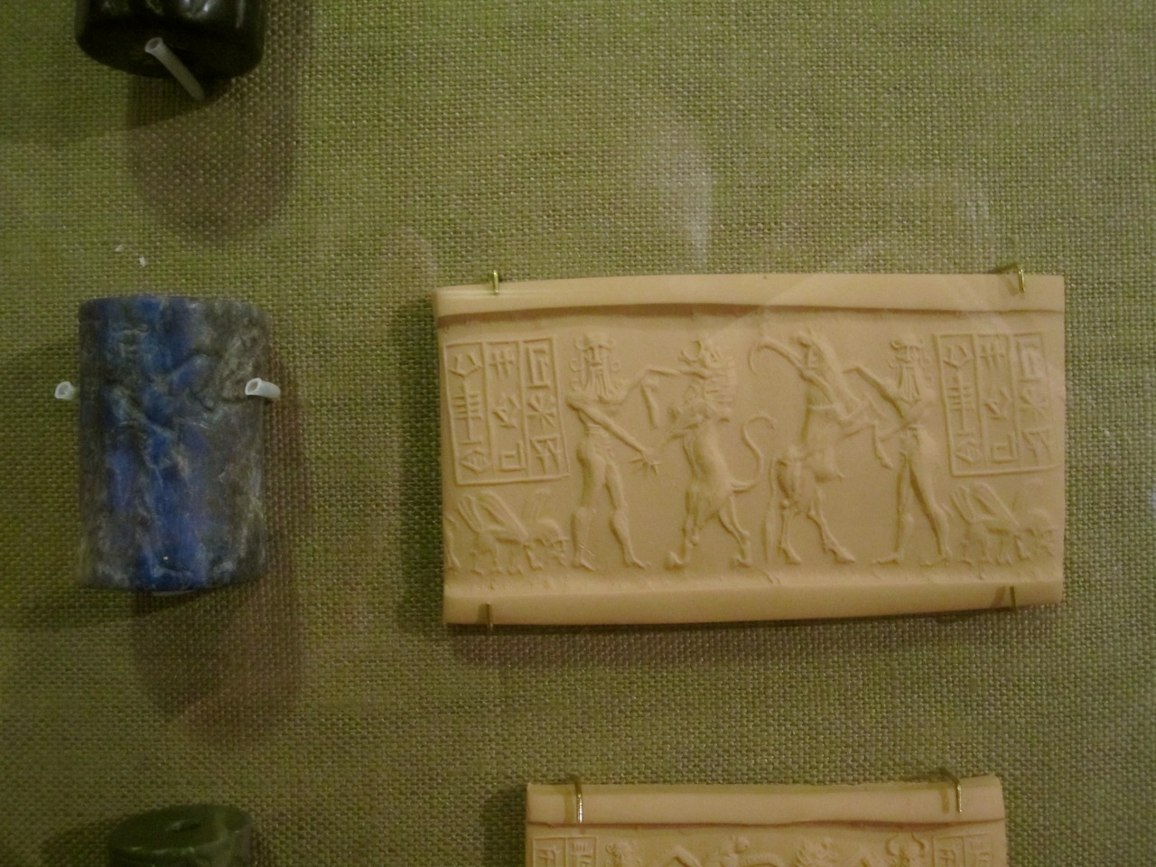 The exhibits start with Sumerian and Babylonian artifacts. I’ve never studied these cultures much as my area of interest has always been ancient Egypt, but these people had a fascinating culture. There was a great display that showed the development of their language from pictographs to these rather odd etchings. I could not make head nor tails of them. I guess that their language was spoken all in one syllable. I didn’t understand this, how would they have enough variation? But, each symbol stands for one syllable that can be combined. So, the phrase for eating would be the symbol for mouth followed by the food symbol. My brain hurts already.