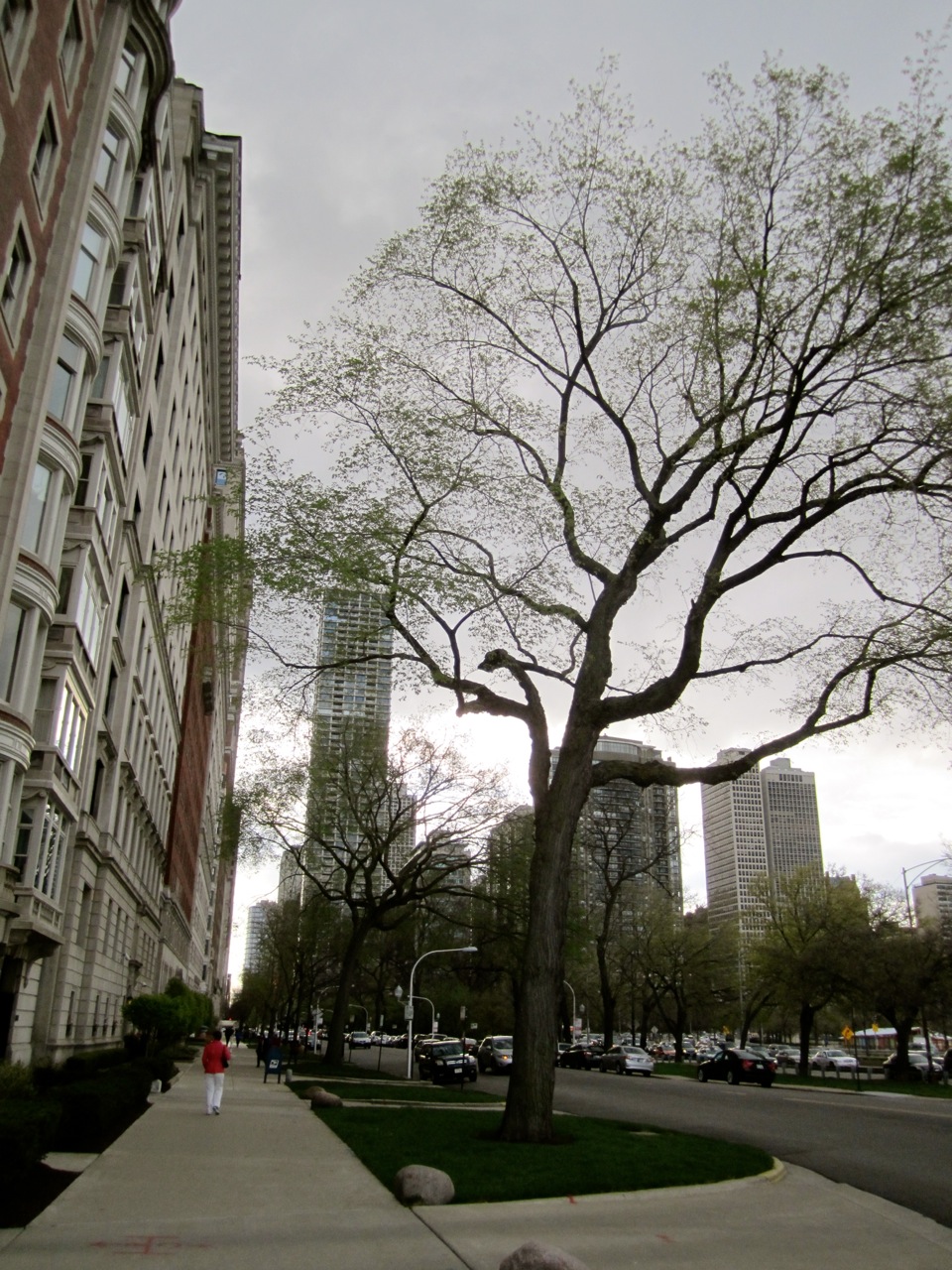 Done with the deserted mall, I kept strolling along the street until I neared the lake. I could find no easy way to cross the very busy roads to stroll along the beach, so I just admired the water from afar. Off in the distance, you could see rain falling and boats tossing on the choppy water. Not a great day for the beach. The whole day was a bit too damn cold.