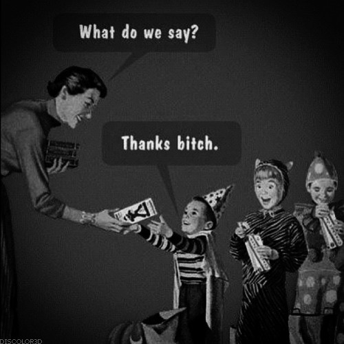 Exactly how I will teach my children to behave. They’re going to be hilariously inappropriate. Did somebody say Hitler mustaches and hooker makeup for Christmas cards? Well, I did.
