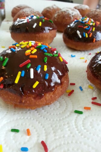 I don’t remember why, but we made donuts and raspberry éclairs together. I’ve never made donuts before and they turned out delightfully. They’re actually a bit of work, so I don’t know why they’re so cheap in the shops. Probably because they’re mass-produced garbage that is made on machines with chemicals that were never intended for human consumption. We learned that donuts have holes in them for a reason! It’s hard to get the insides done right when it’s a massive wad of dough. That doesn’t sound very appetizing. I didn’t have a small enough cookie cutter to cut out the middles. I will the next time I do, though.