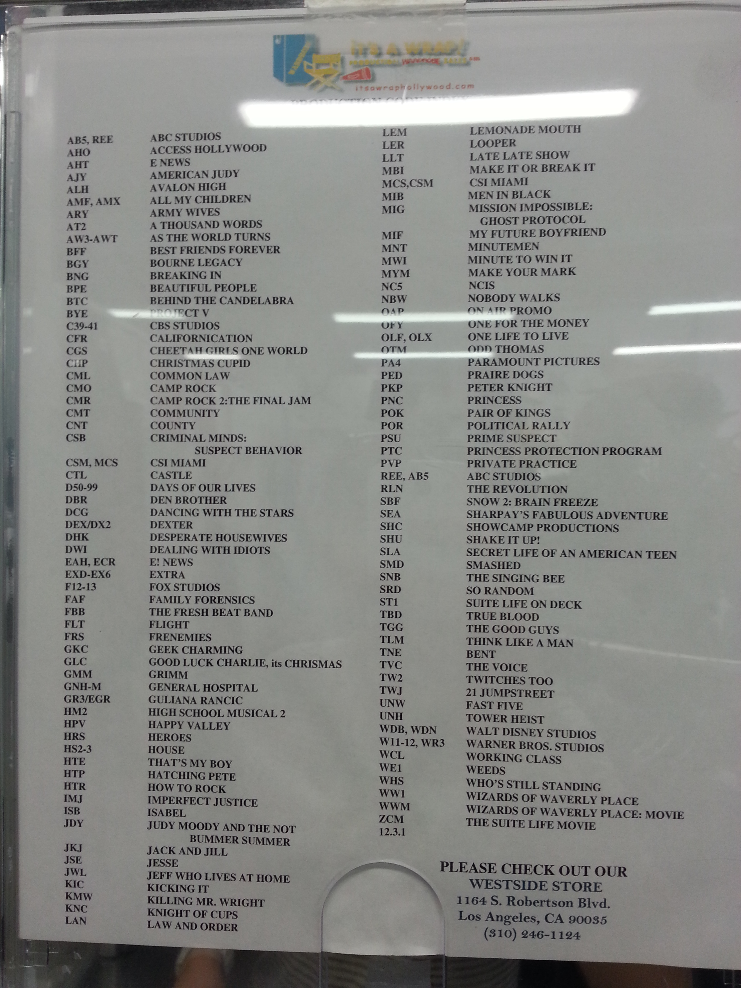 From Porto’s we headed to a shop called It’s A Wrap. There, they sell all sorts of gently-used clothing from television shows and movies. Very exciting to actually wear the clothes you see on the screen, you know?! I was overwhelmed at first. There is clothing EVERYWHERE, and it’s quite a hunt to go through it all to find something that you like AND fits you. I finally found a gorgeous light sweater by ARMANI for $7. SEVEN DOLLARS! It was on The Secret Life of an American Teenager. Never seen it. I also found a pair of pants similar to ones I’ve been looking for for some time. They’re grey and slightly shiny — the kind that make you want to do the tango. They’re from Beverly Hills 90210. I’m going to take them to the tailor down the road to modernize them a bit, though, I find them to be a bit too baggy in the legs and they need hemmed a bit. (Everybody here is really tall, it’s strange!) To find out what show your clothes are from, you look at one of these charts, even though half the codes weren’t on there.