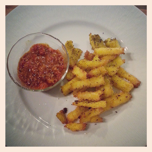 I’ve often been afraid of polenta. I have seen it used in so many cooking programs, but the way it looks has always rather disturbed me. It’s corn and yet it’s gelatinous. Creepy. I think we can all agree on that. Months ago, I bought a copy of Martha’s glorious cookbook, Meatless, and saw a recipe for artichoke hearts and polenta that looked rather appetizing, so I picked up a bag. I promptly shoved it into a cupboard and forgot about it. Recently, I have been hearing people talk and talk about polenta fires. They’re popping up on menus at restaurants I frequent. It was finally time for me to try them. So, I made a batch of the stuff — which was strange, the ground corn is amazingly expansive. Three to four cups of water per cup of polenta. I don’t think I did it correctly because mine was still a bit coarse. I read later that I’m supposed to cook it for a bit longer and some people even toss it into a blender. I’ll try that next time. I chopped the chilled polenta into fry shapes and tossed them into a hot oven with a bunch of tomatoes and garlic to turn into a dipping sauce. Both turned out divinely. It was a triumph. They’re really quite good and taste like a steak fry. Strange. I assume it’s healthier. More experimentation will be needed, of course, but I foresee good things.