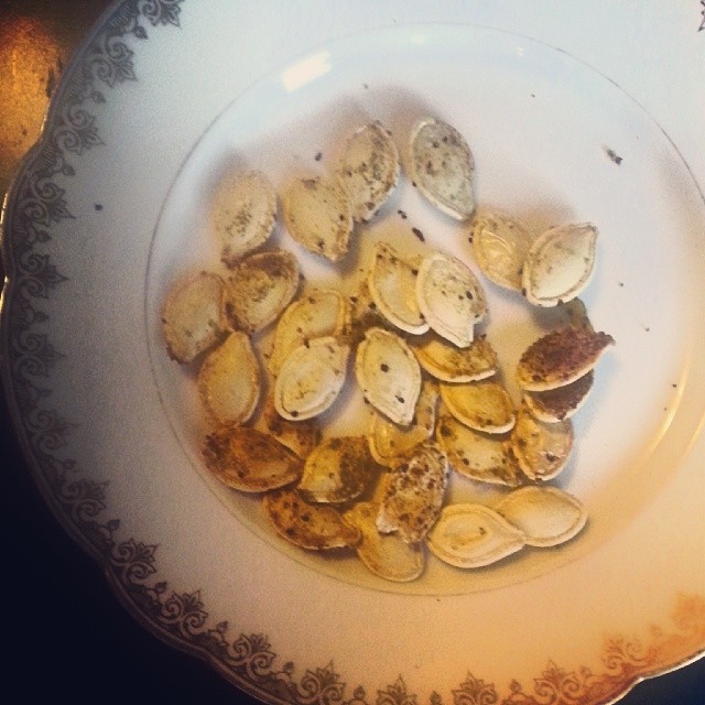 I don’t really remember much about my past, you know? Well, of all the memories I have left of elementary school, my most vivid is a Halloween party we had in second grade. This was back in those carefree times where we could actually carve pumpkins and dress up and have a good time. Le sigh… My teacher took the seeds from the pumpkins and roasted them and I don’t think I’ve ever had anything tastier. Back then, I was easily impressed by table salt and vegetable oil, I guess. Ever since then, I’ve thought of those pumpkin seeds, but never did I make them myself. I don’t know why. The other day, though, for our little Halloween gathering, I roasted the seeds from a couple pumpkins with olive oil and a Greek seasoning blend (by Cavender’s, put it on EVERYTHING) and broiled them for a few minutes. Then, I gorged. Sweet Allah! They were so good. I can’t get over it. They were crispy and chewy and oh so delicious. I literally shoveled them into my mouth. I can’t wait to get home so that I can finish the ones I have left. I’ve been hungrily eyeing the one remaining pumpkin that hasn’t been carved, yet. I can’t wait to devour all of its delicious innards.