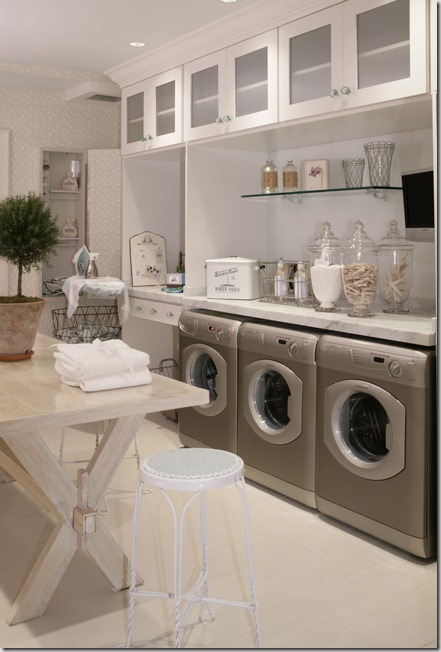 This is one of the chores that I really rather enjoy. Don’t know why since I don’t care for any kind of labor, but I find laundry rather relaxing. I hate when other people do the laundry for me, they do it wrong. I like twisting the knobs and I even enjoy folding the clothes. I don’t know who I am. I’m so into it that I’m thinking of putting up an ironing station in my laundry space. I want to iron all of tea towels so that they’re perfectly crisp. I really think I am Martha’s lost son. I’m going to start experimenting with fabric softener soon, and I’m super excited and that makes me a little bit sad about my life. I also want to put a laundry room together, but something much chicer than this. I can’t stand the thought of apothecary jars in my laundry room.