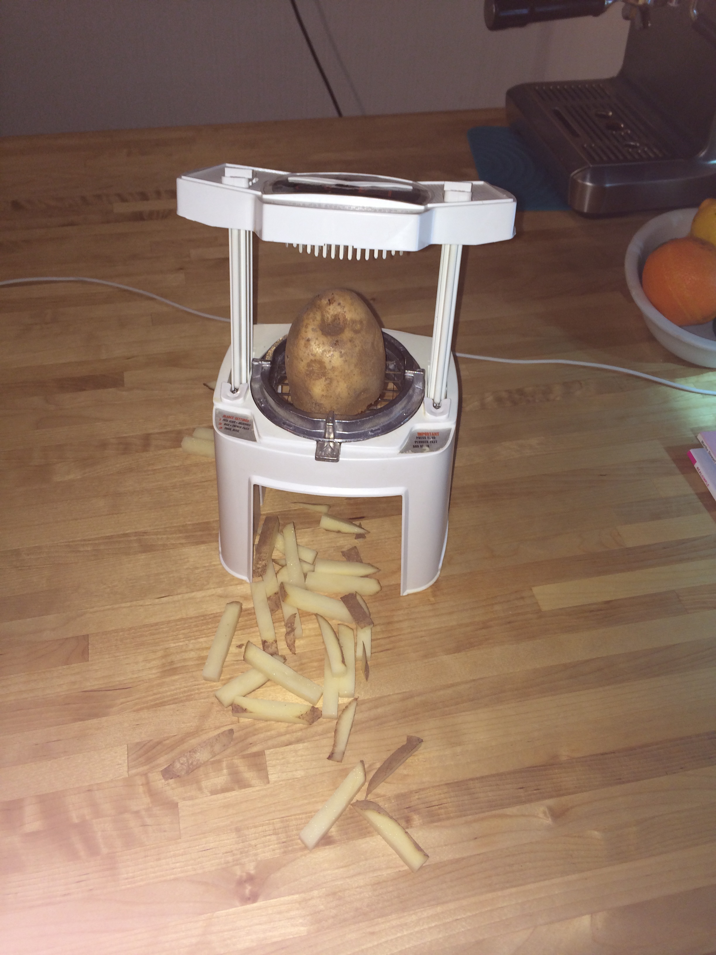 I have developed a great fondness for French fries. I suppose it’s nothing new, I’ve always been a fan. When I was still in school, I think it was high school, there was a restaurant right across the street that made the most unbelievably good cheese fries in the entire world. They had globs of Colby Jack cheese on top and were doused heavily in Cavandar’s, which has ever since been one of my favorite spice blends. The place was awesome. They even had delicious cottage cheese and I would always eat my mother’s fried chicken, I used to eat meat back in those days. Anytime my sister and I could convince her to take us there was a great success and the secret to a happy day. They closed years ago, but it was easy enough to recreate the cheese fries at home, which I have done. But, I’ve never actually made my own fries. It couldn’t be too hard, obviously, they’re just a potato. I had no interest in chopping and frying, though, so it was something that I’ve never done. The other day, as I was reorganizing my cupboards, I came across my grandmother’s old potato chopper. It’s a miracle. You stick a potato in it, press down, and French fries pop out. It probably explains why I’ve gained a few pounds. I’ve been making French fries every damn day. I love baking them soft and then broiling them to get brown and crunch; they’re divine. I made roasted tomato sauce, my lazy delicious sauce — throw some sliced tomatoes, garlic cloves, oil, salt, pepper, and whatever fresh herbs you have on a baking sheet and cook with the fries in the oven, whizz up in the food processor — and it’s heaven. It’s absolutely heaven. French fries are a gift from heaven.