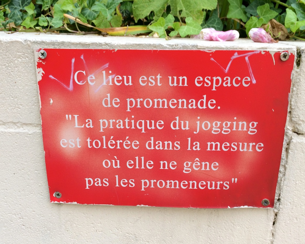 “The practice of jogging in this area is tolerated only where it does not bother the walkers.” I love France.